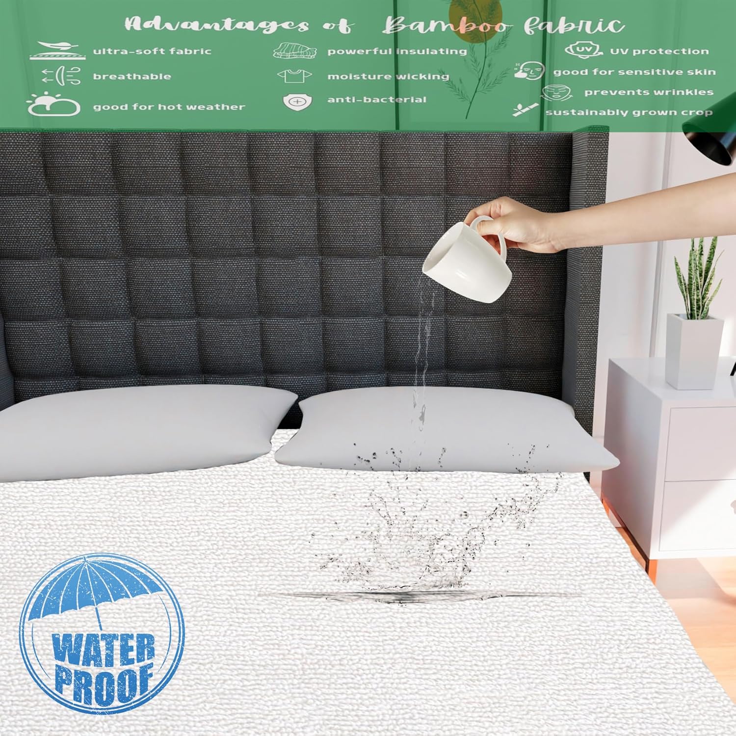 Waterproof Design: The waterproof layer effectively protects your mattress from spills, stains, and moisture, keeping it clean and hygienic.reathable Construction: Despite its waterproof properties, the mattress protector is breathable, allowing for airflow and maintaining a comfortable sleeping temperature.