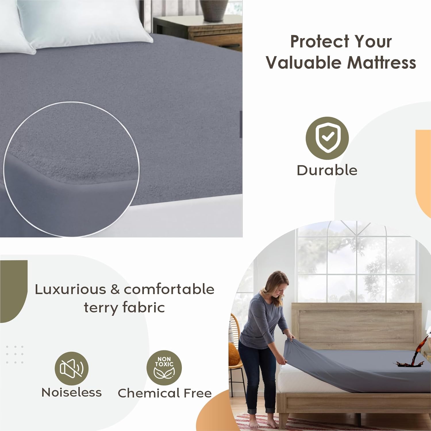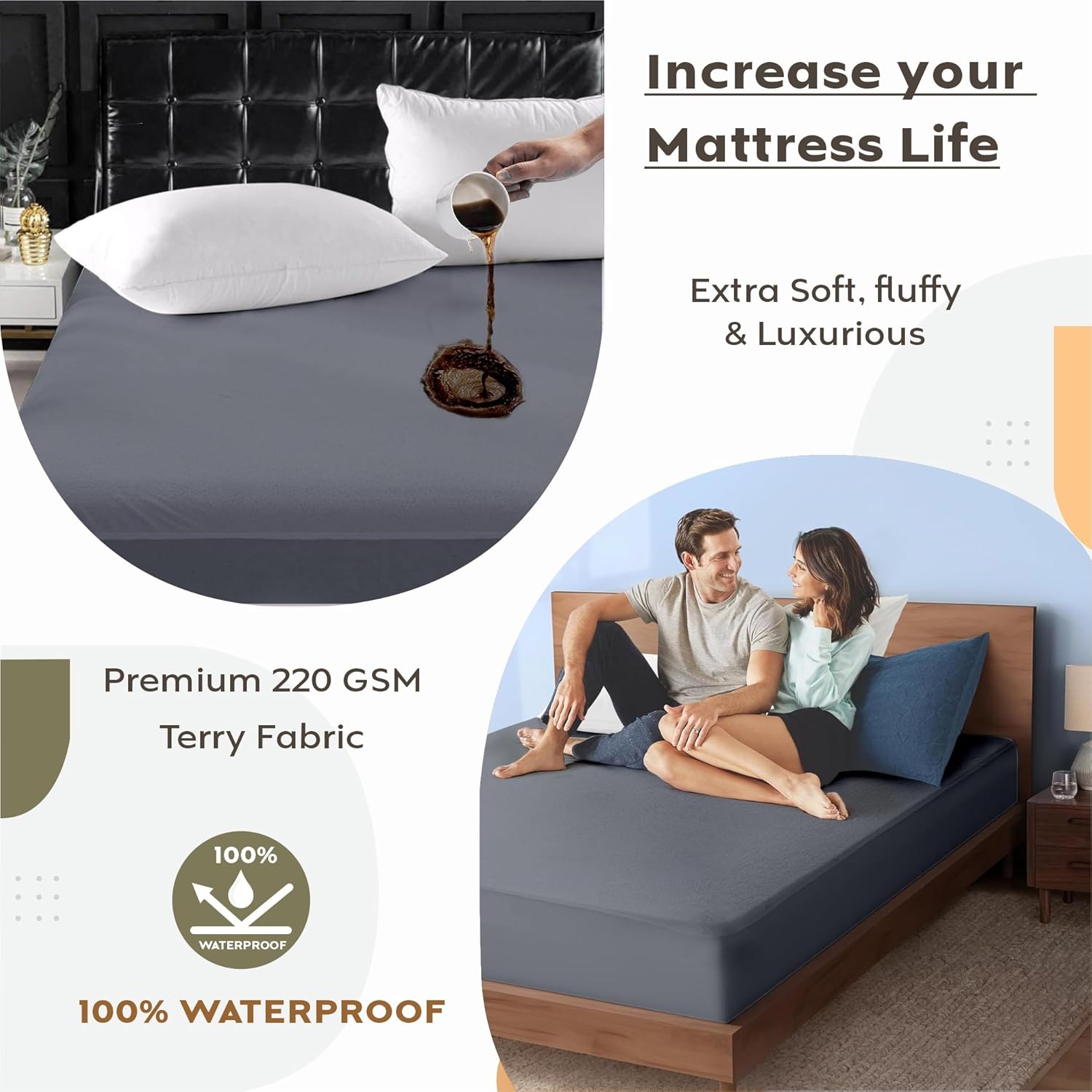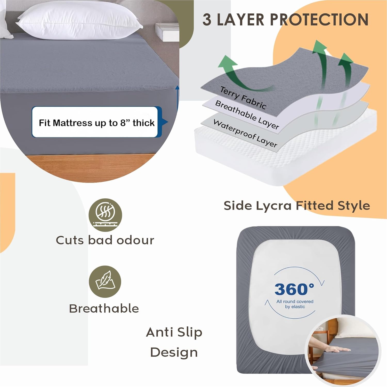 2 layers protection: The top layer soft terry 220 gsm, 2nd layer is TPU laminated sheet which makes the mattress protector 100% waterproof and noiseless with Unique craftsmanship design.