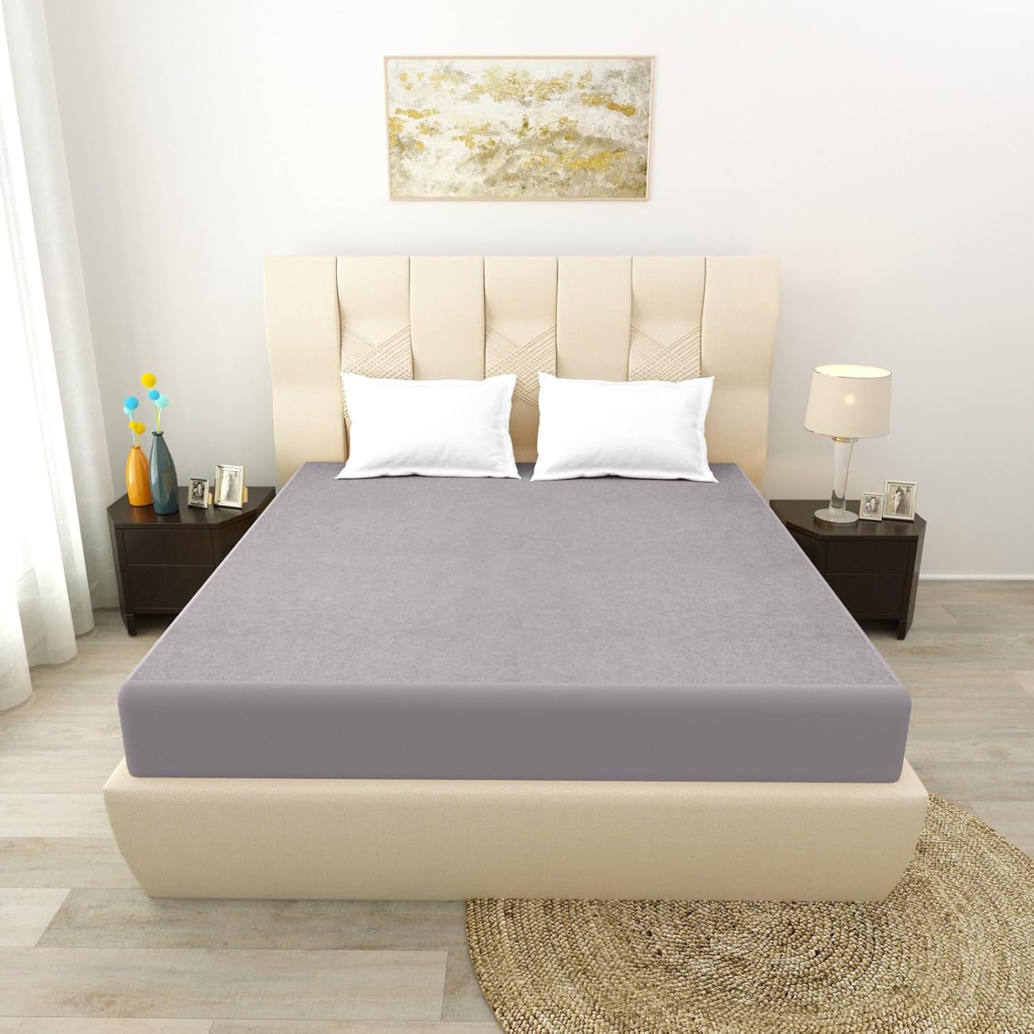 Transform your sleeping experience with this premium double bed mattress protector designed for king size beds. This protective bedsheet cover acts as a reliable barrier, helping keep your mattress clean and extending its life. The fitted design ensures the cover stays securely in place, while the breathable material maintains comfort throughout your sleep. Perfect for safeguarding against daily wear and tear, this mattress protector features elastic edges that wrap snugly around your mattress. The waterproof surface helps protect against accidental spills and stains, making it an essential addition to your bedding ensemble. Easy to maintain, this mattress protector can be machine washed and dried, ensuring hassle-free care. Whether you’re looking to protect a new mattress or extend the life of your current one, this king size protector offers the perfect solution for your bedding needs.