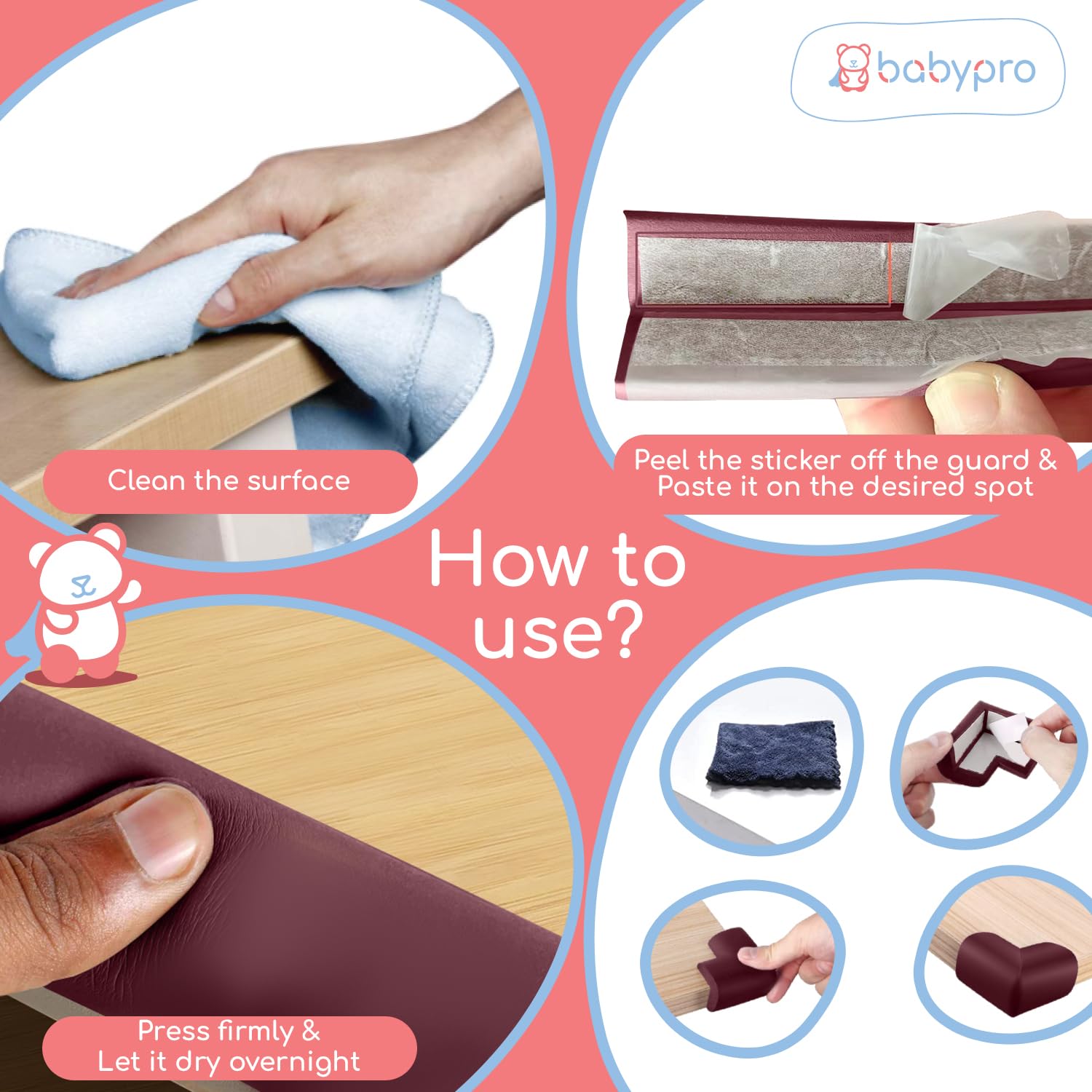 INSTALLATION: FOR BEST USE, PLEASE CLEAN THE AREA WITH A DAMP CLOTH TO WIPE OFF ANY DUST OR DIRT PARTICLES & THEN MAKE SURE THE SURFACE IS DRY BEFORE STICKING THE PRODUCTS. THIS WILL ENSURE THE ADHESIVE STICKS WELL TO THE SURFACE & STAYS THERE LONGER! ALSO, APPLY THE TAPE ON THE EDGES OF THE EDGE GUARD. HAPPY BABYPRO’S PANDRO MEANS HAPPY PROPARENTS 🙂
