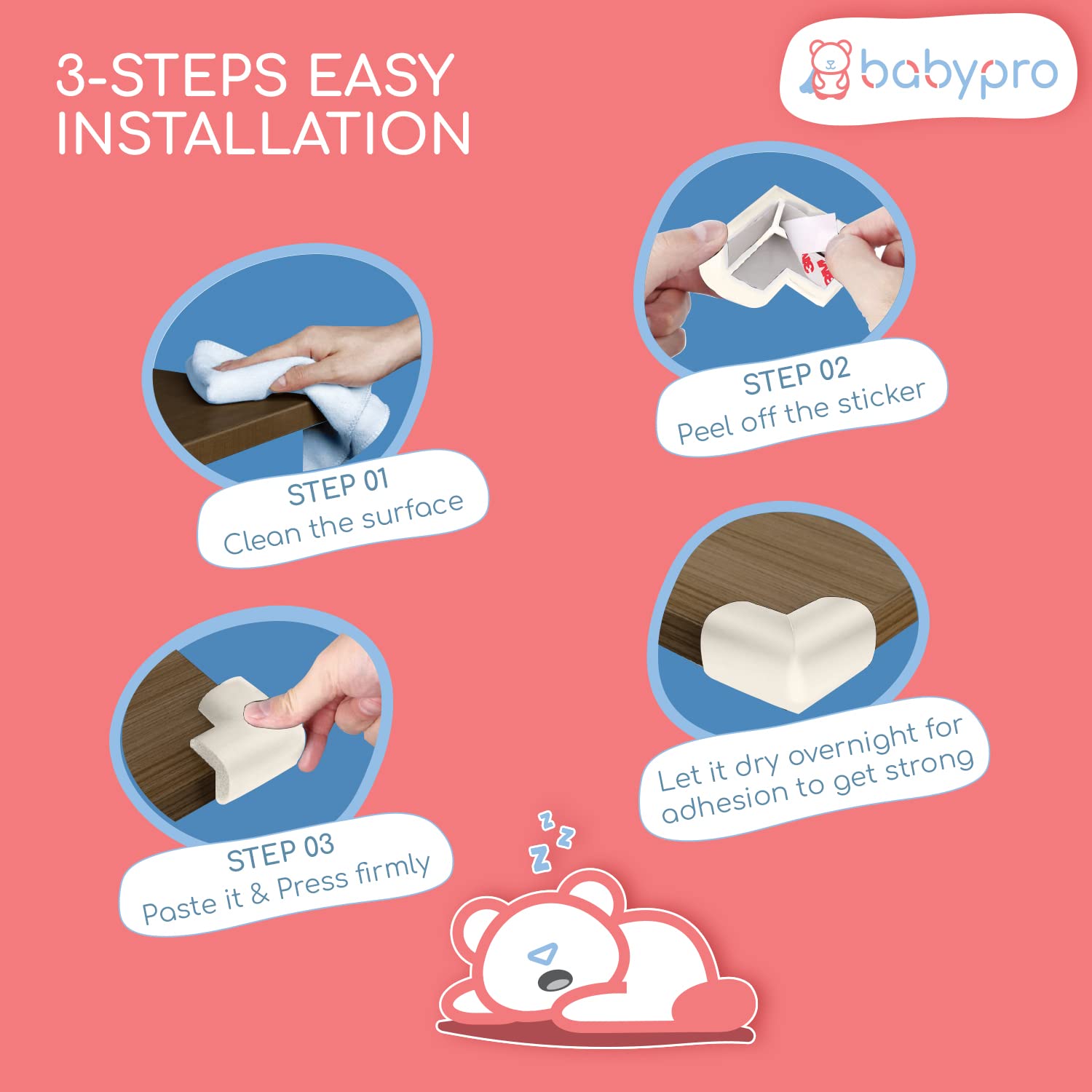 INSTALLATION: FOR BEST USE, PLEASE CLEAN THE AREA WITH A DAMP CLOTH TO WIPE OFF ANY DUST OR DIRT PARTICLES & THEN MAKE SURE THE SURFACE IS DRY BEFORE STICKING THE PRODUCTS. THIS WILL ENSURE THE ADHESIVE STICKS WELL TO THE SURFACE & STAYS THERE LONGER! HAPPY BABYPRO’S PANDRO MEANS HAPPY PROPARENTS 🙂