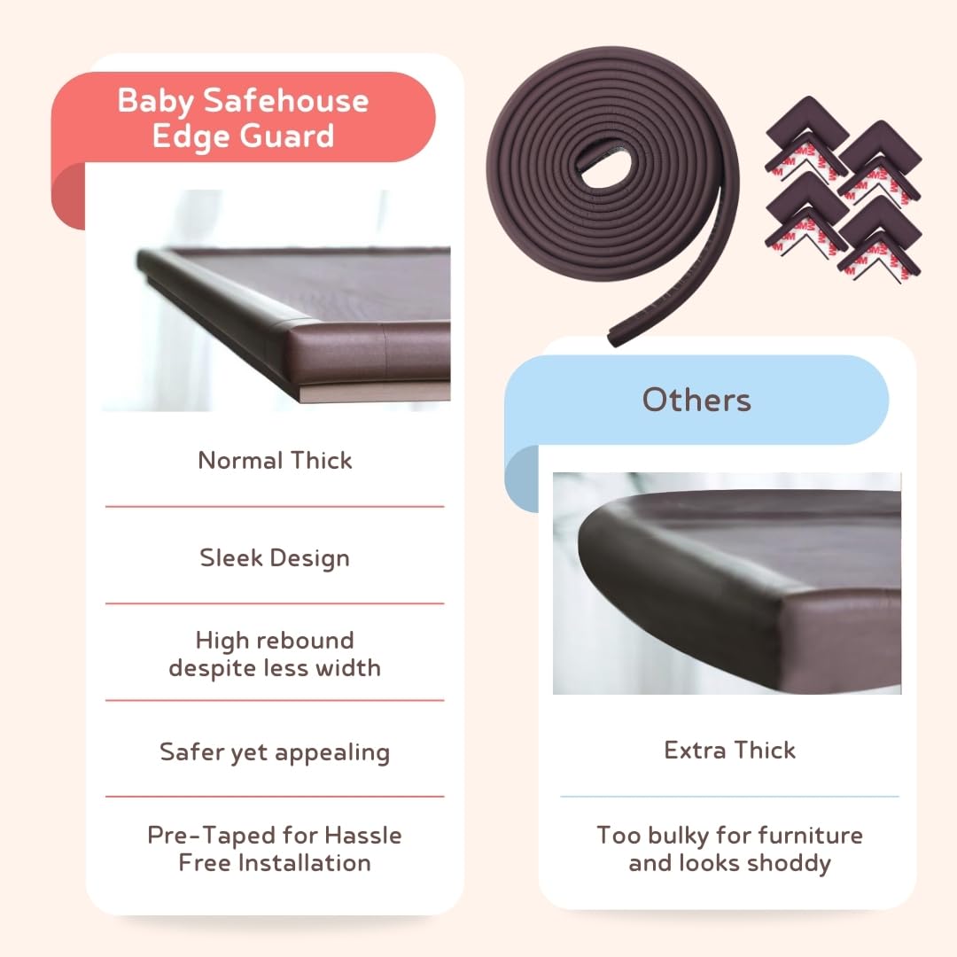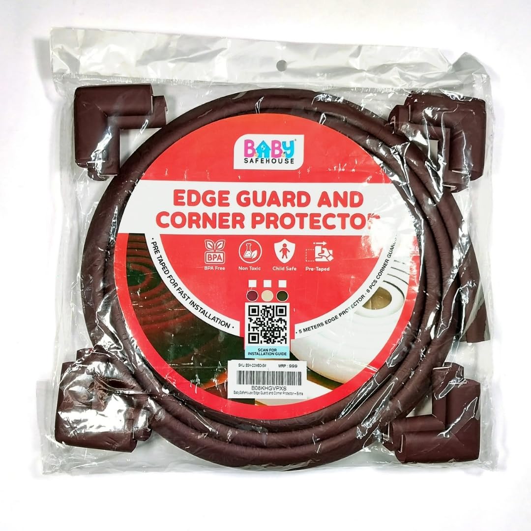 JUMBO COMBO: 1pc 5 meter (16.4ft) Pre-Taped Brown Color Safety Strip, 8 pre-taped Child Corner Guards, 1 Monkey Shape Door Stopper and Installation Manual.