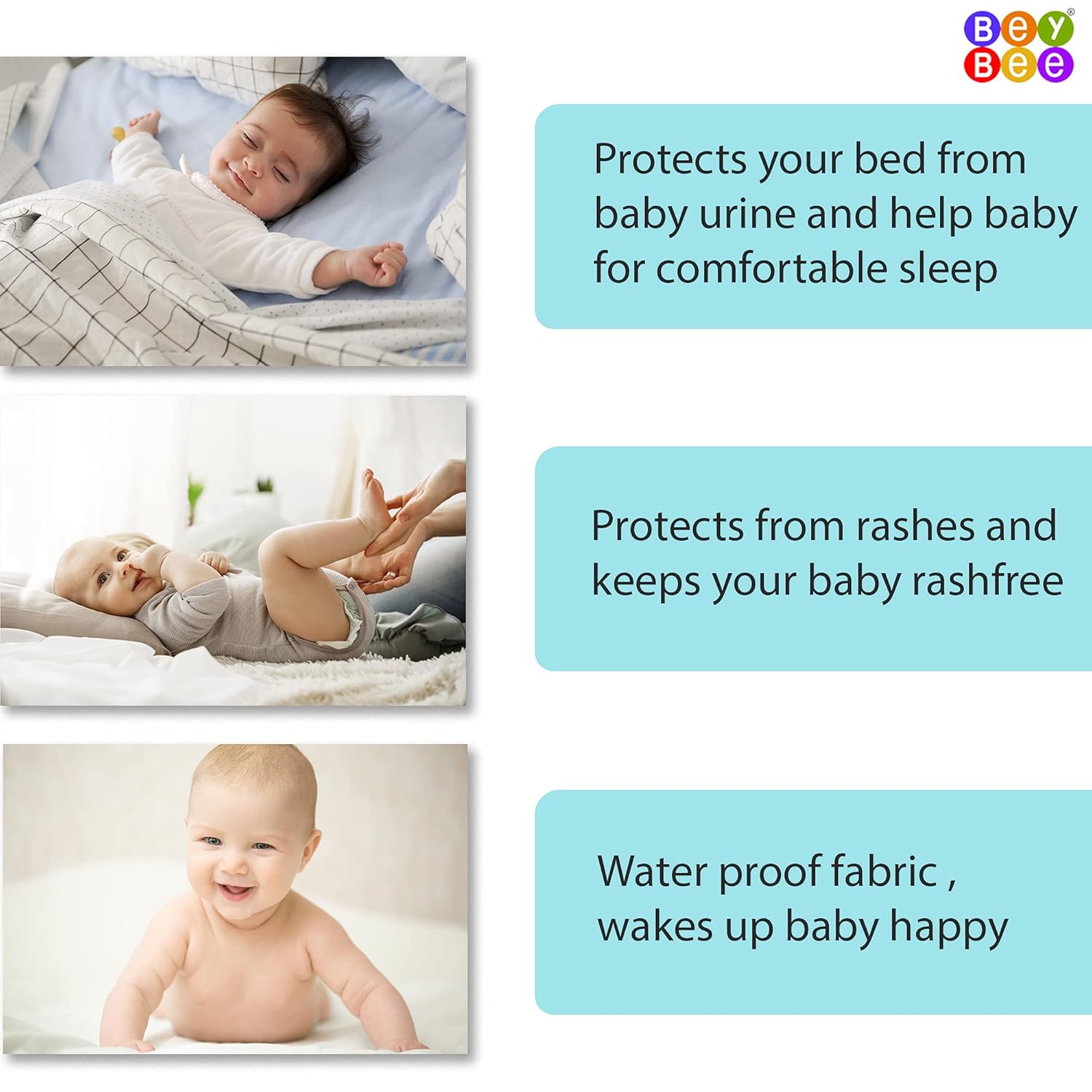 Bey Bee is a comfortable fabric mat with an extra dry layer to prevent bed wetting. Also, baby’s skin breathes better, enjoys cottony softness, and is kept moisturized against friction. Give your baby the freedom to enjoy uninterrupted sleep for longer periods. “Bey Bee” prevents urine and other liquids from going down and dries faster as the fabric layer promotes the removal of water vapor. It allows moisture to pass through, thereby giving comfort to the skin. It is an alternative to PVC mats, rexine-sheets, rubber-sheets & under-pads, which might be uncomfortable, un-breathable and may cause perspiration. “Bey Bee” is soft, absorbent and water-proof, thus, making the mat usable for babies & adult also.