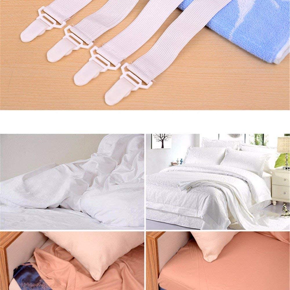 Material: Plastic + Nylon Elastic Cloth Belt These bed sheet corner grippers make your life easier Use sheet fasteners and never worry about messy or wrinkled sheets again They are easy to fix and remove, and keep your bed looking great at all times Package Includes: 4 * Bed Sheet Fasteners, one for each corner of a bed, easy and effective to use Very useful for your bed room. It is very easy to fix and remove and stretchable. Easy to use, and excellent to clip bed sheet, satin sheet, mattress covers, blankets etc. Color: White Size:21.5*2.5cm(Adjustable) Material: Nylon + Plastic Package Includes: 4 * Bed Sheet Fasteners Elastic Bed Sheet Grippers Clip Easy to use, Very useful for your bed room. Just attach the bed sheet keepers to your bed sheet by using the clamps, then your sheet will look great all the time. The innovative T Shaped bed sheet gripper is versatile which work great with various bed sheets, mattress pads, blankets, even ironing board covers and more. These sheet keeper straps are easy to put on and will keep fitted sheets from sliding off from corners all night and keep your bed looking great at all times. Never worry about messy or wrinkled sheets again.