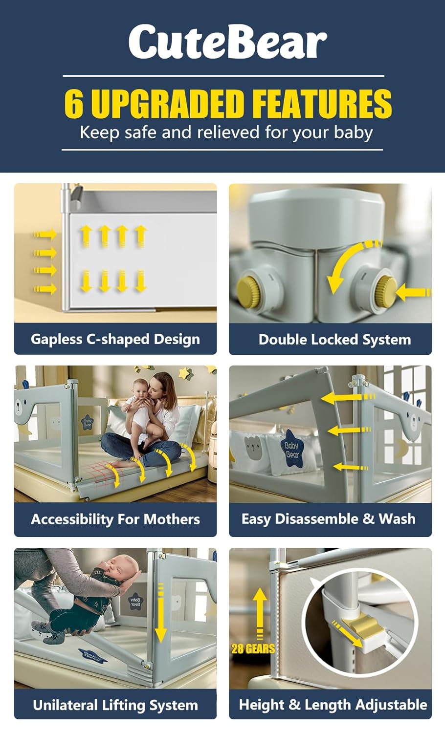 EXTRA LONG & TALL: 38/54/60/70/75/78 inches long and 30 inches tall for added security, the height of the base can be adjusted from 0 to 9 inches and the long of the bed rail can be adjusted from 0 to 2 inches to increase the adaptability of installing different types of beds. The cross base adds stability, more ways to secure the guardrail, the child is not easy to climb out and fall, you can have peace of mind.