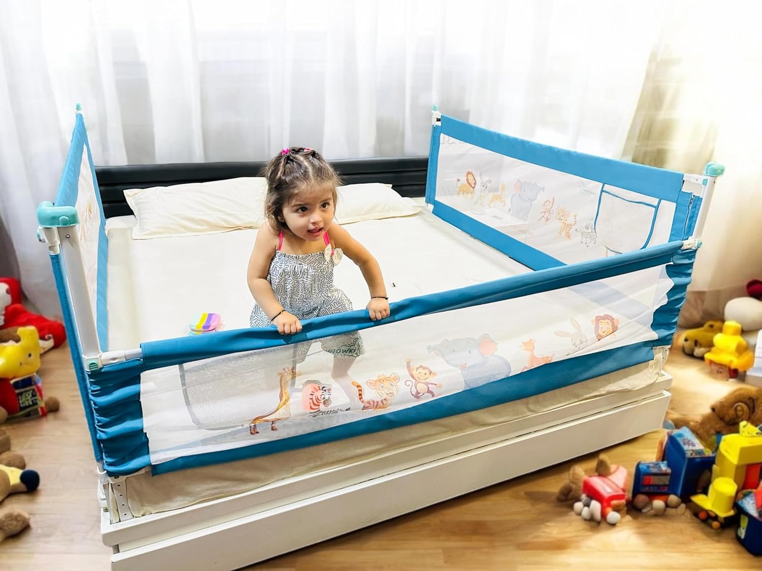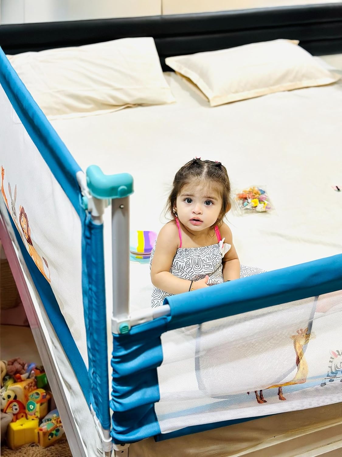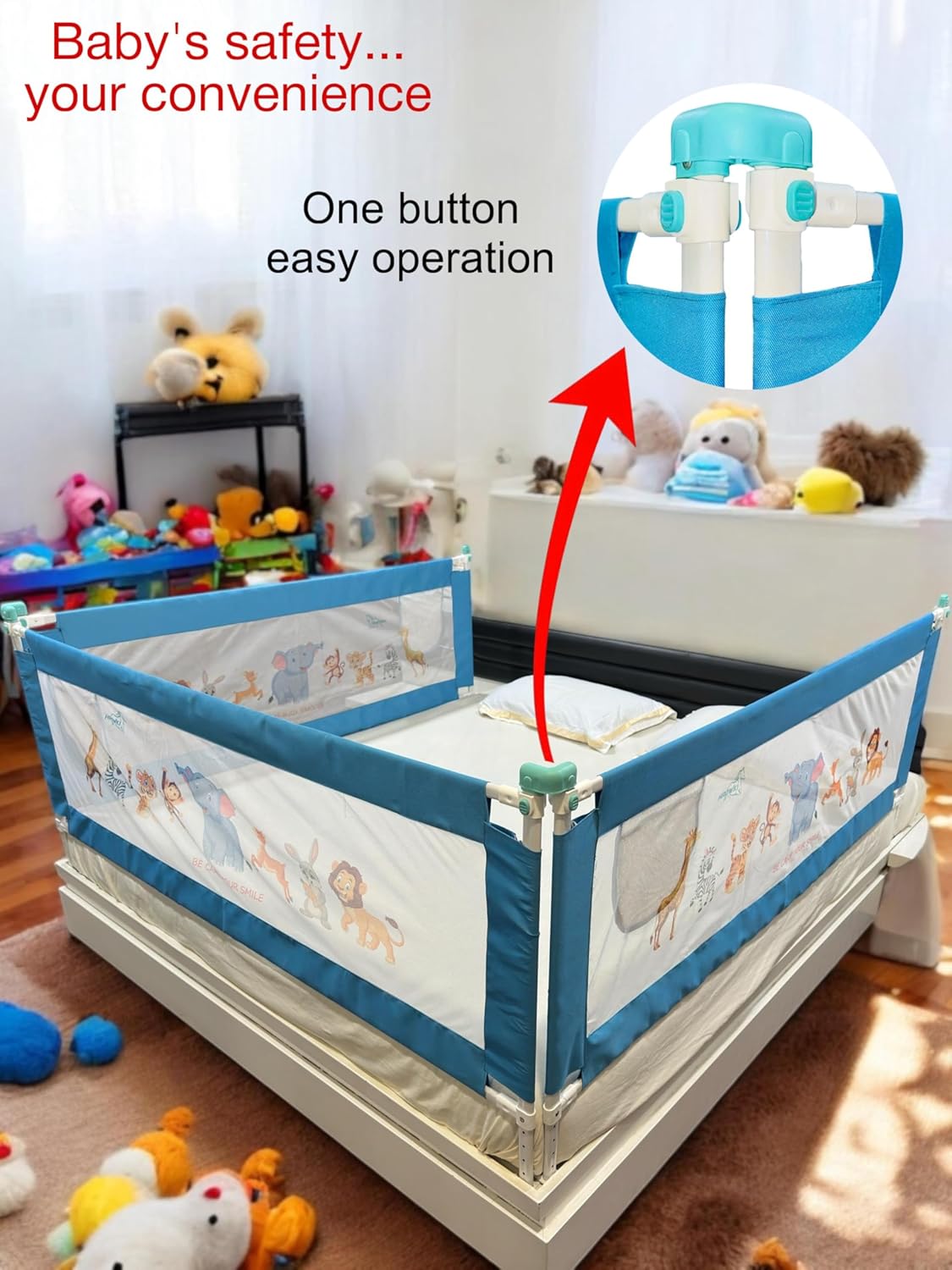 A baby bedrail includes a storage component. It is designed to provide a safe and secure sleeping environment for babies while also offering convenient storage for items such as diapers, wipes, blankets, and toys. Baby bedrail storage can be particularly useful for parents or caregivers who need to keep essential baby items close at hand during the night. It can also help to reduce clutter and create a more organized and functional space in the baby’s room. Bedrail height adjustable refers to a type of bedrail that can be adjusted to different heights to accommodate different bed sizes and user needs. It is important to ensure that any bedrail, including height adjustable models, are installed correctly and securely to prevent accidents or injuries.