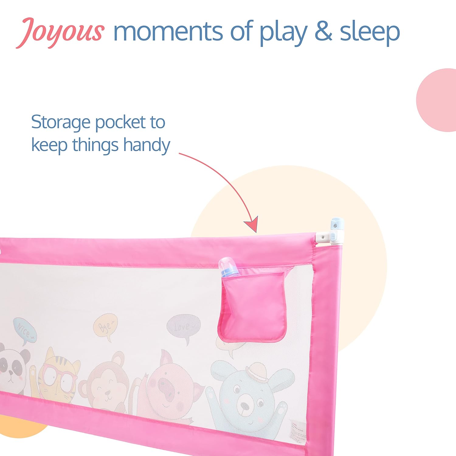 Baby bed side rails can be folded down by pressing the safety locks on both ends to help parents to sit by the bedside easily. Comes with a storage pocket to store baby essentials.