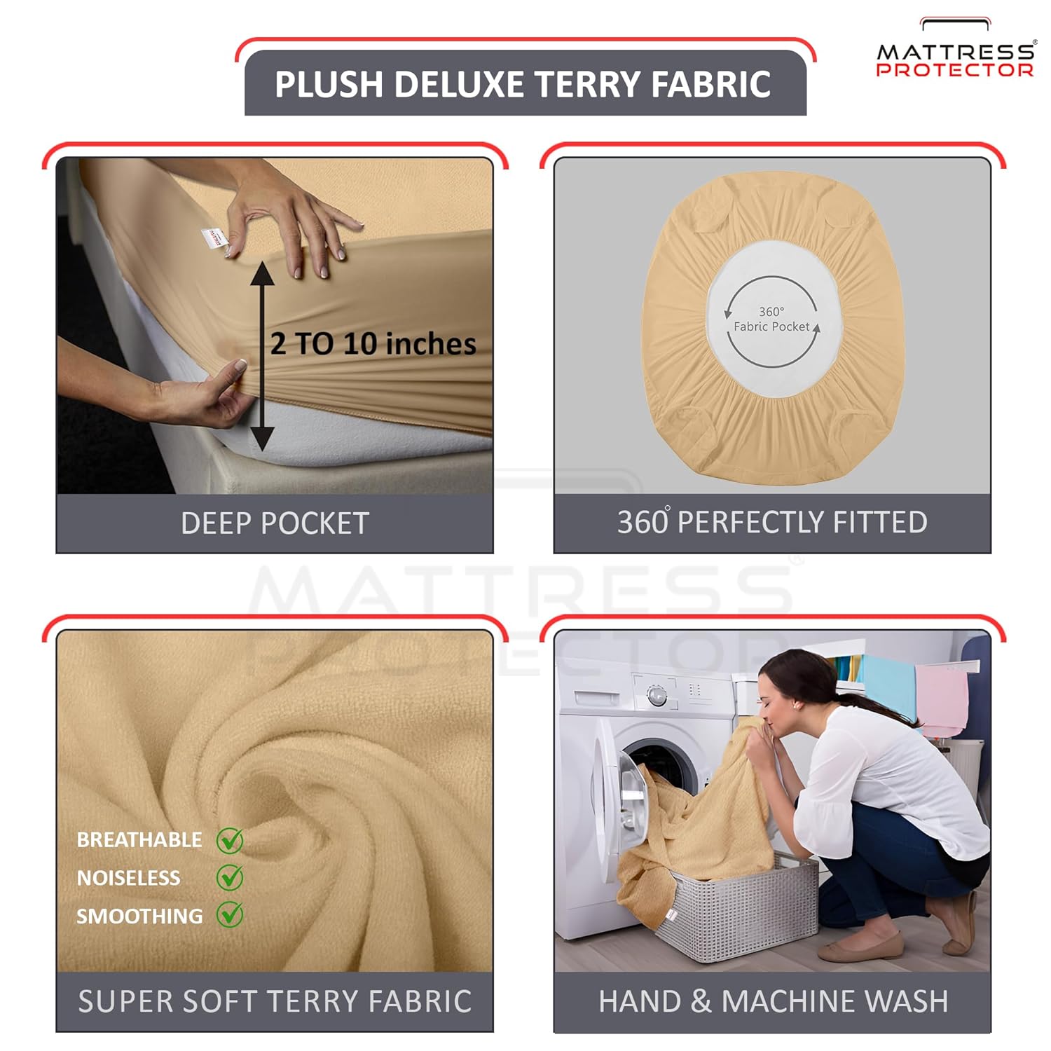 ✔ Protector Feel: Soft and textured | Material Type: 200 GSM terry cotton surface with TPU film | Elastic for tucking in the corners.