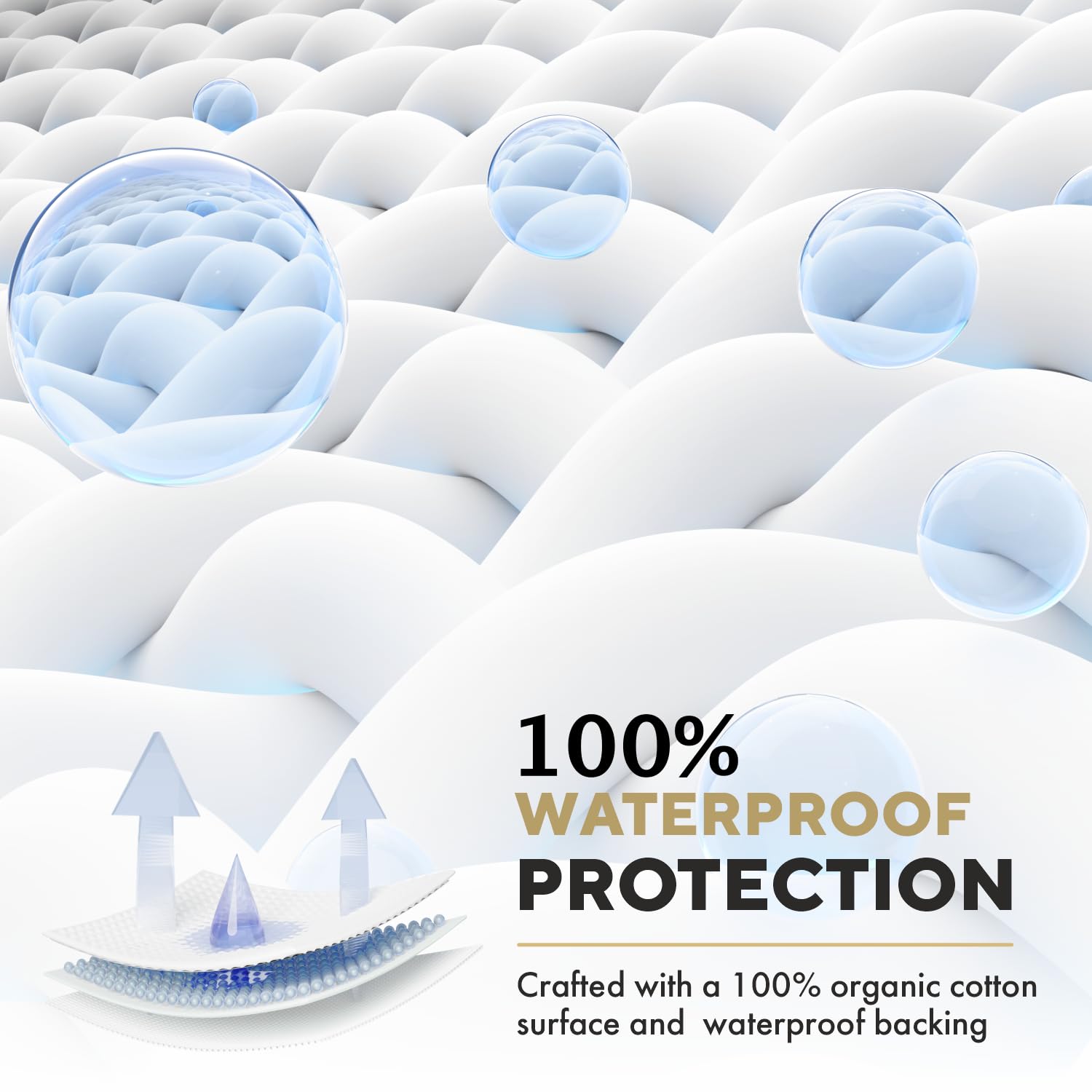 ORGANIC COTTON FABRIC: Enjoy the super soft touch of 100% Organic terry cotton fabric surface, ensuring a comfortable sleep while keeping your mattress clean and protected. Breathable material for temperature regulation.