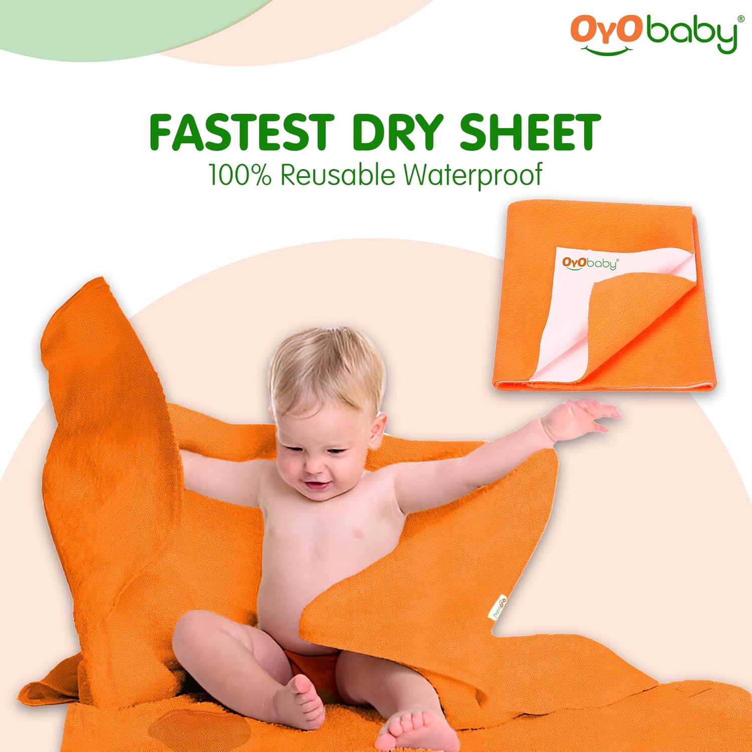 Oyo Baby is made of 100 percent waterproof organic material and highly absorbent. Freedom to enjoy uninterrupted sleep for longer periods. Dries faster, diaper free night and rush-free skin, cozy, smooth and silky feeling. Waterproof baby bed protector is breathable this sheet has cozy, soft and smooth top surface for baby to have sound sleep all night with maximum protection. Oyo Baby quick dry protector is a skin friendly and heat-free soft and unique multi layer noiseless fabric sheet. It is an alternative to PVC mats, rexine-sheets, rubber-sheets and under-pads. Highly hygienic and breathable water proof membrane and durable. Holds water up to 8 time of it’s weight and dries instantly. Reusable, economical and light weight. Ready to use anywhere you go.