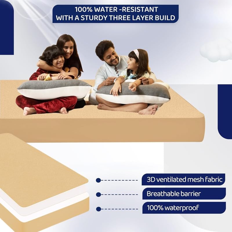 Protect your expensive mattress while enjoying a luxurious sleep experience with this 100% Waterproof Premium Cotton Feel Mattress Protector for King Size beds. Designed with ultra-soft terry fabric, this mattress protector offers the cozy touch of cotton while shielding your bed from spills, stains, dust mites, and allergens. The beech color adds a neutral elegance that complements all bedroom interiors.Crafted with a breathable waterproof membrane, it blocks fluids without compromising air circulation, ensuring a cool, sweat-free night’s sleep. Its fitted style with strong elastic edges wraps snugly around your mattress like a bedsheet, preventing slipping or bunching even during tossing and turning. Whether you have kids, pets, or simply want to extend your mattress’s life, this protector is your ideal choice. It is machine washable, low-maintenance, and built for long-lasting durability, making it a must-have bedroom essential for Indian homes.