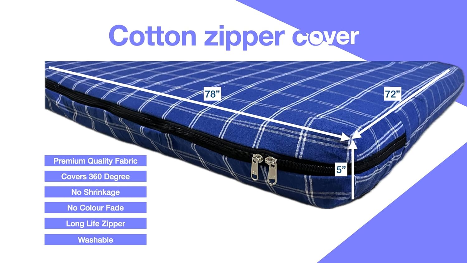 Cotton mattress covers size 78*72*5 inch OR 6/6.5 feet :- made of heavy , non shrinkable fabric which Makes your mattresses more comfortable. It covers all the sides of mattress. Zip across length makes it Easy to remove and cover .Heavy fabric, Superior quality chain with pair of metal locks , Inside stitches interlocking makes it lifelong .To make it life long ,These covers are made one inch bigger on both sides than the size mentioned . Same size of covers can be ordered for same size of mattresses. For size customization please contact seller.Pack of 1