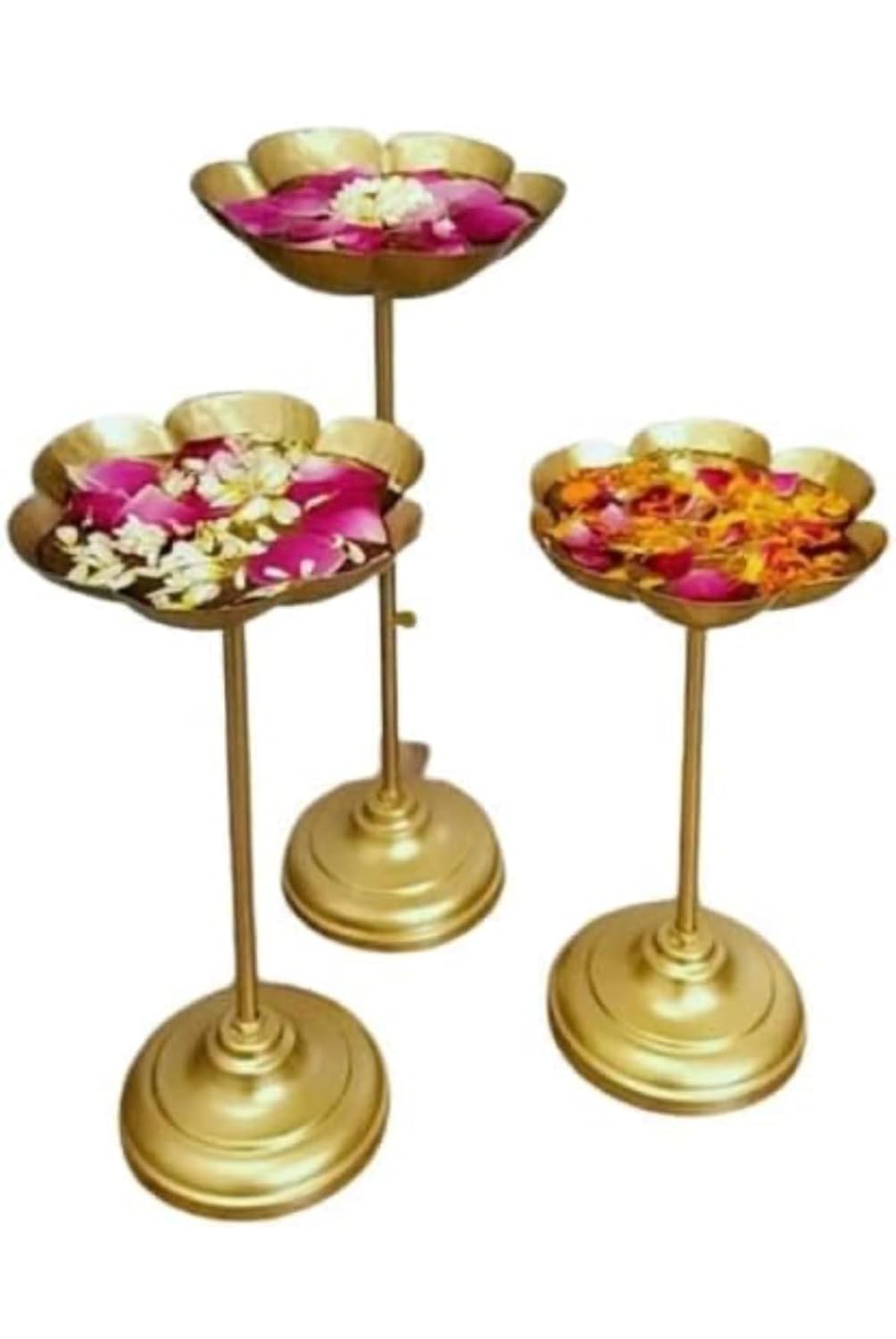 Elevate your home decor with this luxurious Urban Set of 3 Urli Bowl tealight Holder Stand, a traditional Indian brass decorative bowl set perfect for Diwali and puja celebrations. Crafted from high-quality brass, these exquisite bowls exude an opulent charm that adds a touch of elegance to any space. Ideal for floating flowers or placing tealights, they create a warm, inviting ambience. The intricate designs and golden hue of the Taj Stand Set beautifully complement Indian aesthetics. Enhance your living room, entryway, or mandir with this stunning set, a harmonious blend of tradition and sophistication. Dimensions: (Please provide measurements in metric units if available).