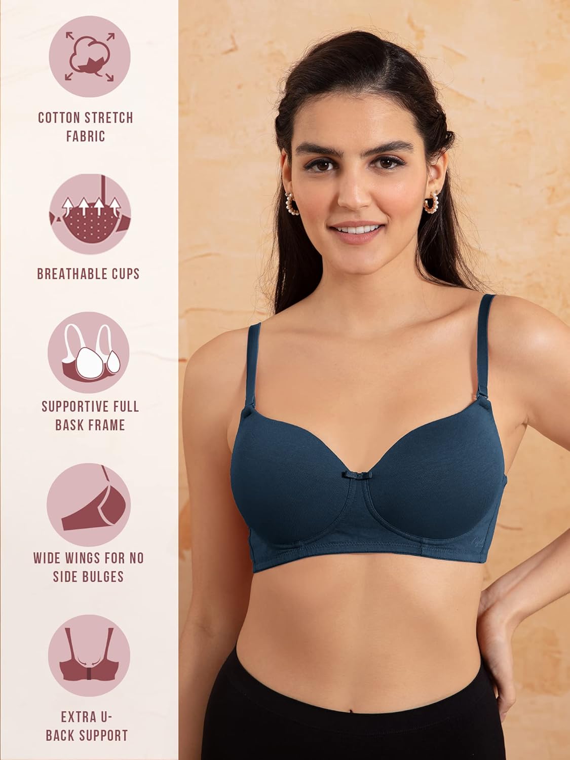 How it feels: Our signature Breathable T-shirt Bra is high on technology, comfort and functionality. Super-soft for everyday comfort, it feels like a gentle warm hug Bottom-Band: Ultra soft, bottom-band to avoid rashes Coverage: 3/4th Coverage Designed for: 32-38 band sizes, B-D cups Fabric: Fabric: Soft, cotton, stretchable fabric for comfort round the clock Cups: Perforated cups designed to let your skin breathe all day Straps: Super-soft, detachable straps with a multiway feature of converting into cross-back Wire: Wire-free with ample support and shape Wings: Wide coverage for better support Wear it under: Everyday Western and Indianwear outfits for a seamless look