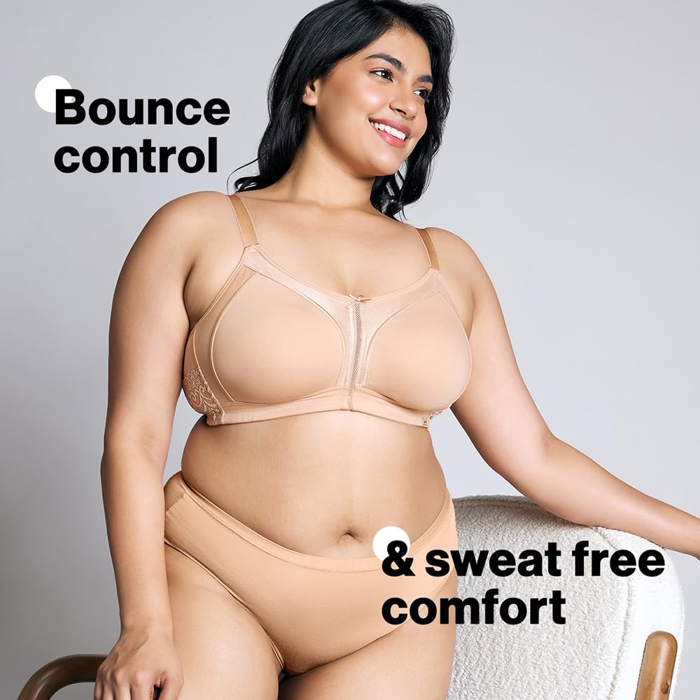 Our 24/7 cotton support bra is designed with signature M-Frame for maximum support and lift. M-frame will ensure extra support and no spillage from the top. With features like wide soft straps to relieve pressure on shoulders, cotton fabric on cups for a clean look and side shaping panel for extra support, this one is your go-to everyday bra. Bottom-Band : Wide bottom band designed keeping in mind comfort and support for your body type. Coverage : Full Coverage Fabric : Soft and strong, stretch cotton fabric for all day comfort. Cups : Non padded. Engineered cup panels with double layer cotton fabric for maximum support. Wire : Wirefree Comfort Wear It Under : All your everyday outfits
