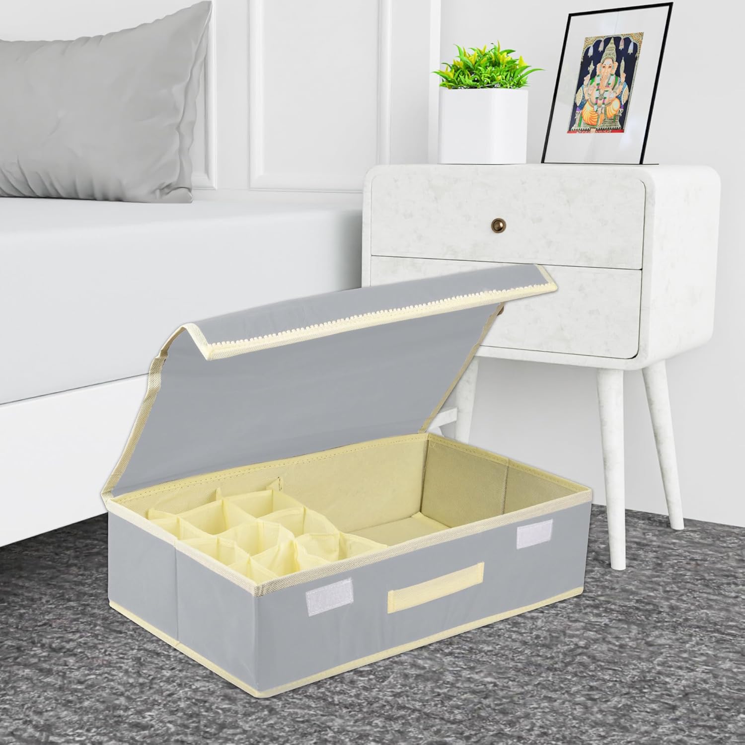 { PACKAGE CONTAIN } : 1 Piece Undergarment Organizer | MATERIAL : Non-Woven | Cream-Patti | 16 Compartments | Velcro Lock | PACKAGE DIMENSION : 52 cm x 33 cm x 14 cm