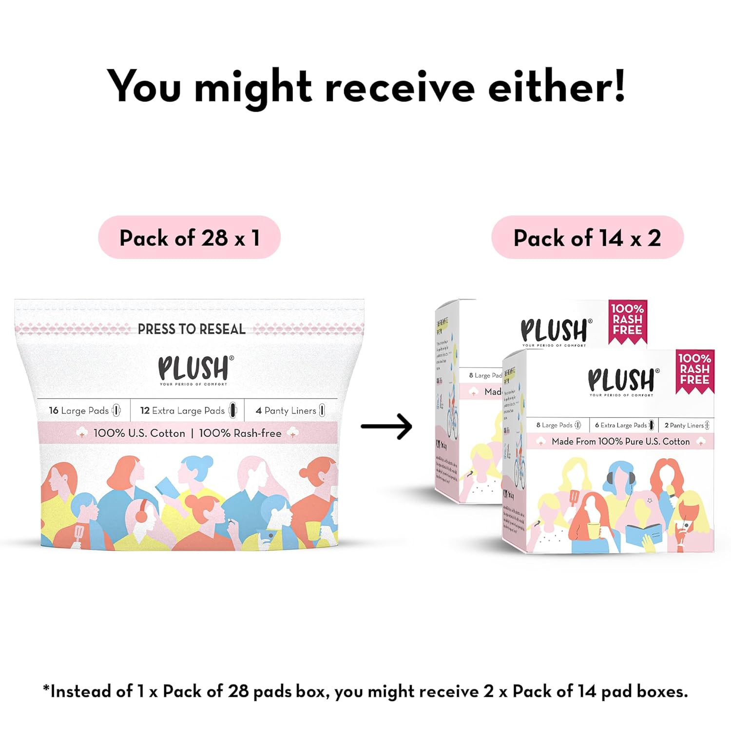 14 CURATED SOFT PADS WITH LINERS – This box contains 12 Medium Flow XL, 16 Light Flow L and 4 Panty Liners For Rash Free Periods, crafted to cater to all your flows throughout your cycle. All naturally absorbent and safe for sensitive skin
