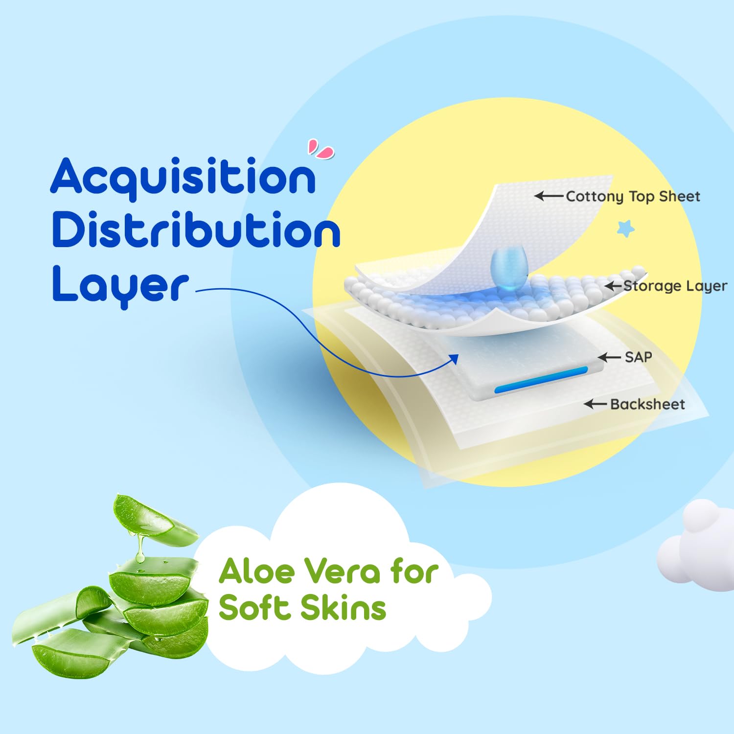 HIGH ABSORBENCY:- The large absorbing area of the pad ensures maximum dryness for the baby. It can hold up to 7 glasses of liquid, where 1 glass is equal to 50 ml.