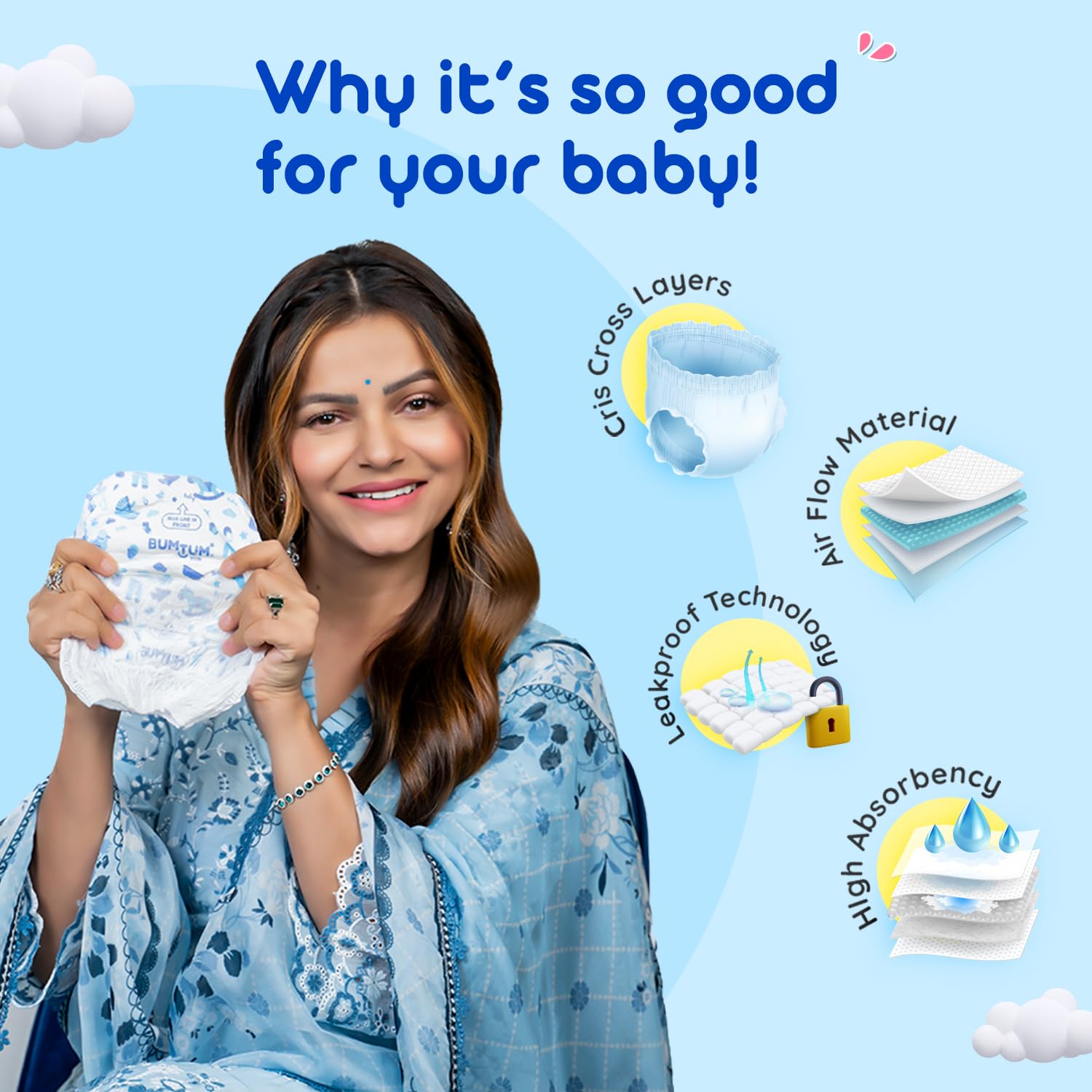 BUMTUM PANT-STYLE DIAPERS: are uniquely curated to keep your baby’s day & night full of comfort and materialized with cottony soft, breathable, and non-woven material that ensures a cosy experience.