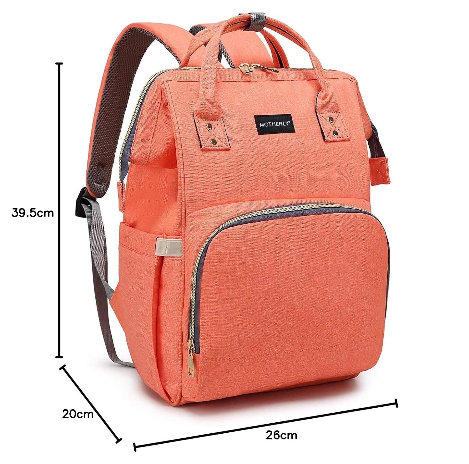 Highlights: 13 well-sized pockets for storage and organization, roomy main section, three 14 cm x 8.15 cm insulated milk bottle pockets, separate dry and wet sections, anti-theft back pocket, front and back openings for easy accessibility, key chain clip, D-rings for hands-free usability, adjustable 5-cm wide cushioned back straps.