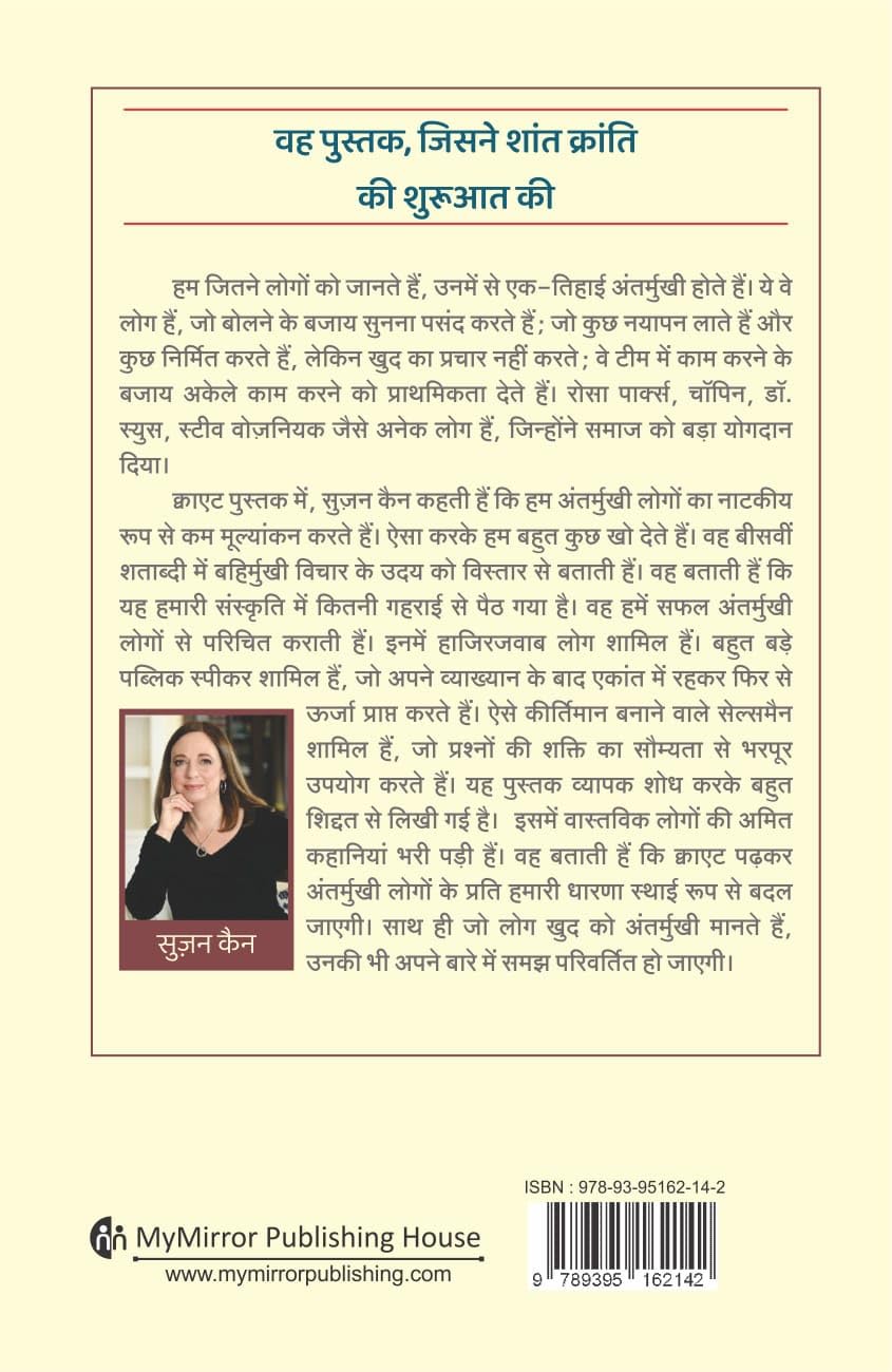 #1 न्यूयार्क टाइम्स बेस्ट सेलर हमेशा बोलती रहने वाली दुनिया में अंतर्मुखी लोगों की ताकत वह पुस्तक, जिसने शांत क्रांति की शुरूआत की हम जितने लोगों को जानते हैं, उनमें से एक-तिहाई अंतर्मुखी होते हैं। ये वे लोग हैं, जो बोलने के बजाय सुनना पसंद करते हैं; जो कुछ नयापन लाते हैं और कुछ निर्मित करते हैं, लेकिन खुद का प्रचार नहीं करते; वे टीम में काम करने के बजाय अकेले काम करने को प्राथमिकता देते हैं। रोसा पार्क्स, चॉपिन, डॉ. स्युस, स्टीव वोज़नियक जैसे अनेक लोग हैं, जिन्होंने समाज को बड़ा योगदान दिया। क्वाएट पुस्तक में, सुज़न कैन कहती हैं कि हम अंतर्मुखी लोगों का नाटकीय रूप से कम मूल्यांकन करते हैं। ऐसा करके हम बहुत कुछ खो देते हैं। वह बीसवीं शताब्दी में बहिर्मुखी विचार के उदय को विस्तार से बताती हैं। वह बताती हैं कि यह हमारी संस्कृति में कितनी गहराई से पैठ गया है। वह हमें सफल अंतर्मुखी लोगों से परिचित कराती हैं। इनमें हाजिरजवाब लोग शामिल हैं। बहुत बड़े पब्लिक स्पीकर शामिल हैं, जो अपने व्याख्यान के बाद एकांत में रहकर फिर से ऊर्जा प्राप्त करते हैं। ऐसे कीर्तिमान बनाने वाले सेल्समैन शामिल हैं, जो प्रश्नों की शक्ति का सौम्यता से भरपूर उपयोग करते हैं। यह पुस्तक व्यापक शोध करके बहुत शिद्दत से लिखी गई है। इसमें वास्तविक लोगों की अमित कहानियां भरी पड़ी हैं। वह बताती हैं कि क्वाएट पढ़कर अंतर्मुखी लोगों के प्रति हमारी धारणा स्थाई रूप से बदल जाएगी। साथ ही जो लोग खुद को अंतर्मुखी मानते हैं, उनकी भी अपने बारे में समझ परिवर्तित हो जाएगी।