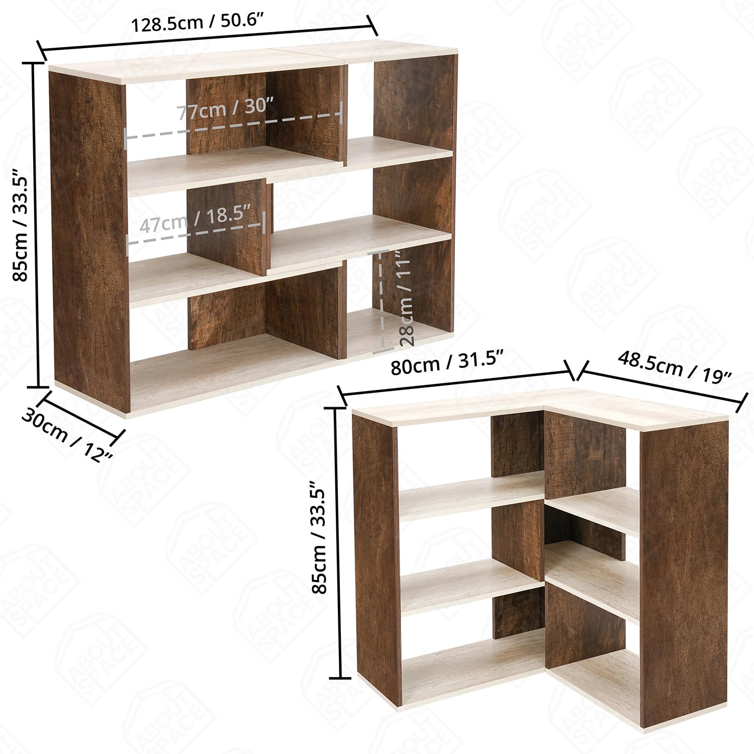 ABOUT SPACE Book Shelf for Home Library-Rectangle/L-Shaped Rack for Storage 6 Compartment Book Stand Shelf for Bedroom, Livingroom Decor, Plants and Books (Oak White&Walnut-L128 x B30 x H85 cm)