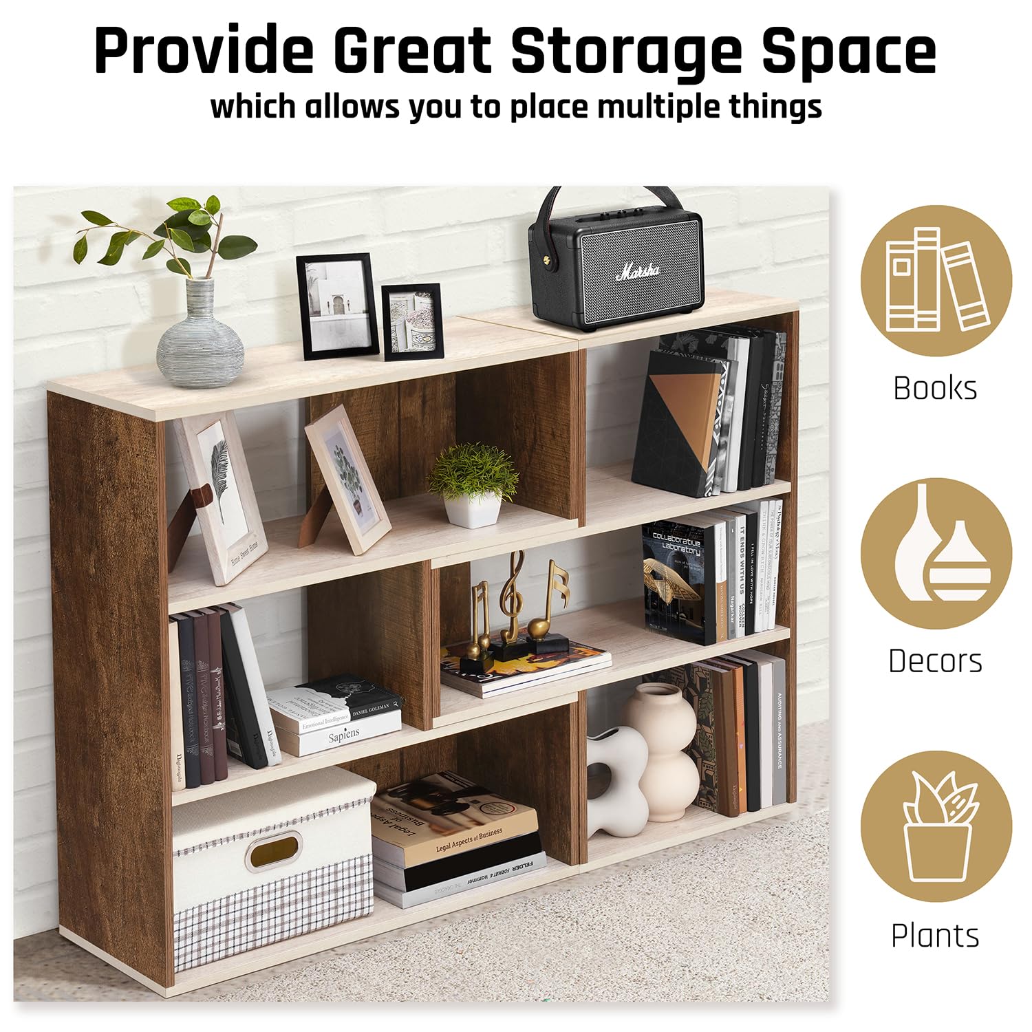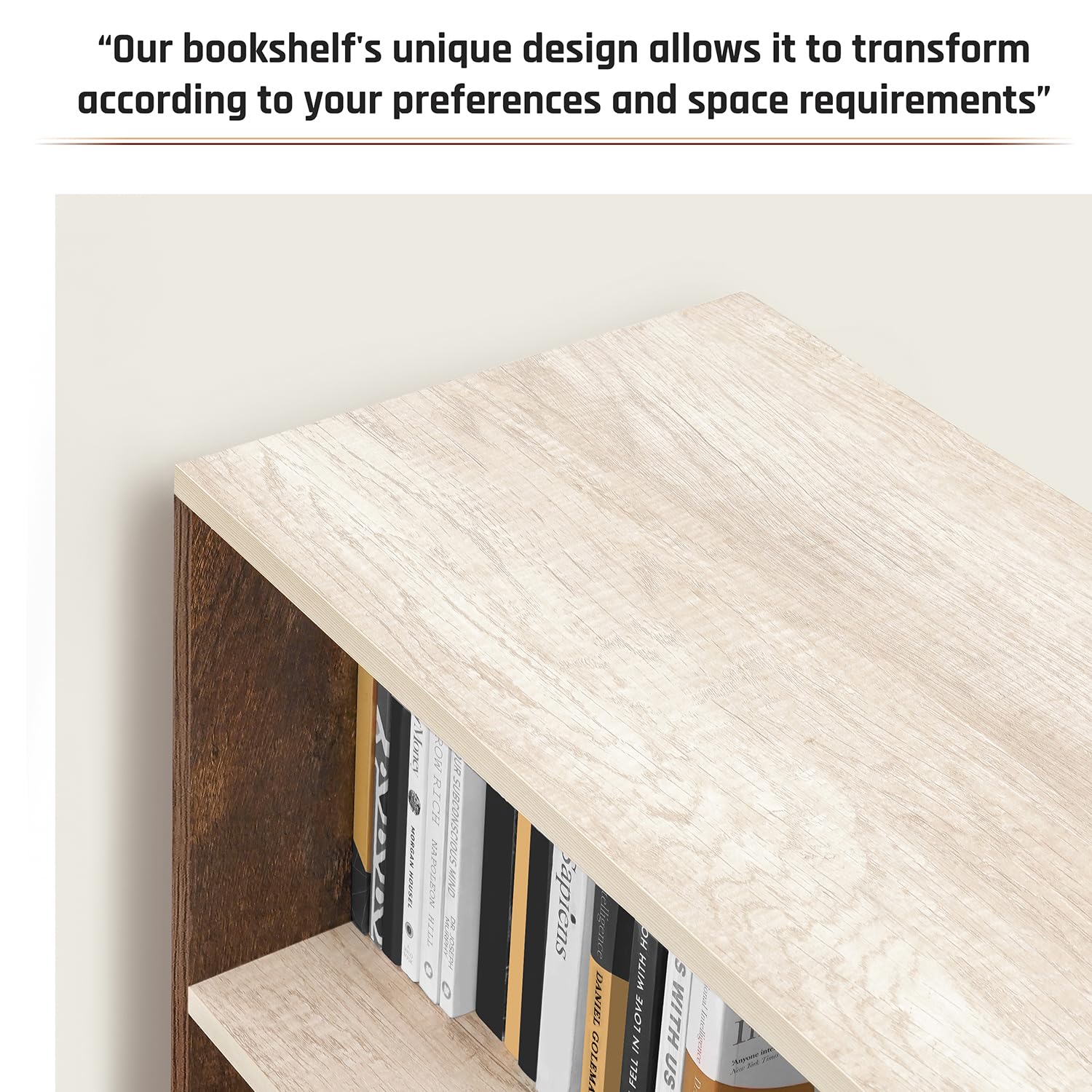 DISPLAY UNIT: Our book shelves unique design allows it to transform according to your preferences and space requirements. The book shelf wooden can be used as two separate 3-compartment units to display your decors, souvenirs and plants