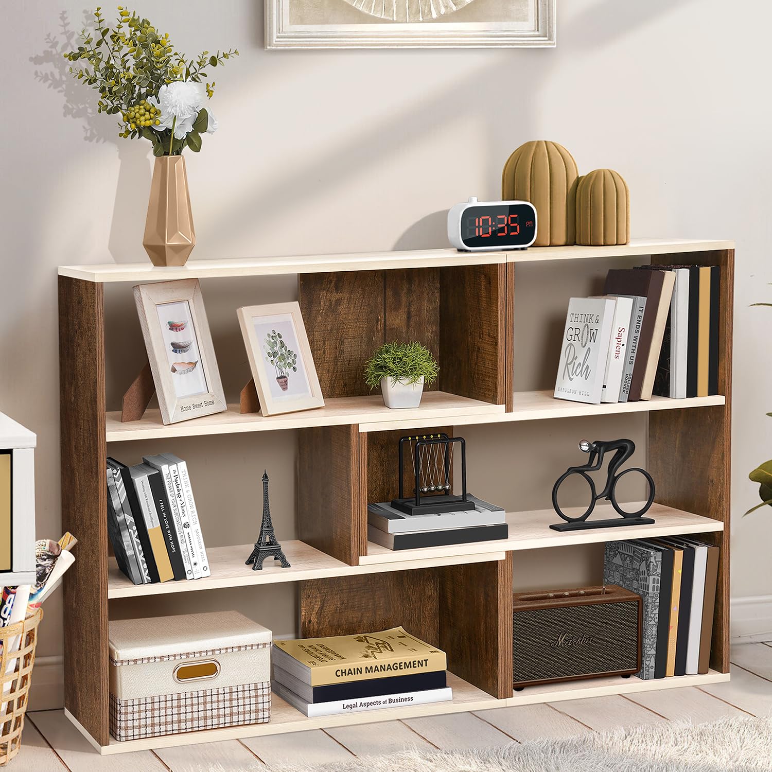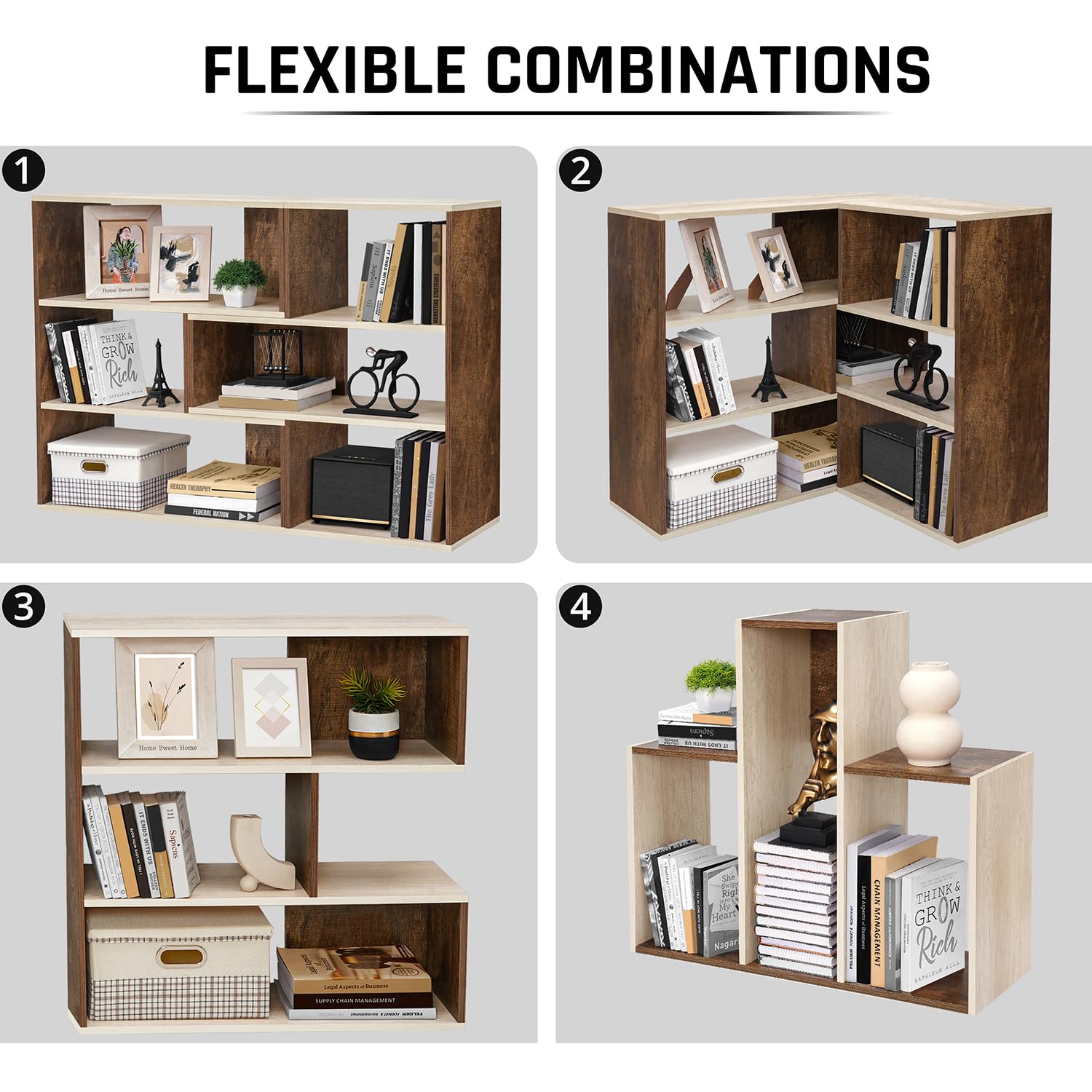 BOOK SHELF FOR HOME: The bookshelf can be used as two separate 3-compartment units and combined as a 6-compartment shelf according to the decoration style of your home. It can be used as a rectangular bookshelf and also as an L-shaped corner bookshelf. Perfect for home library, living room, or study room providing flexibility in arranging your books, family photos, magazines, book holder, book stand for table, book light, bookmark, book organizer and decorative items.