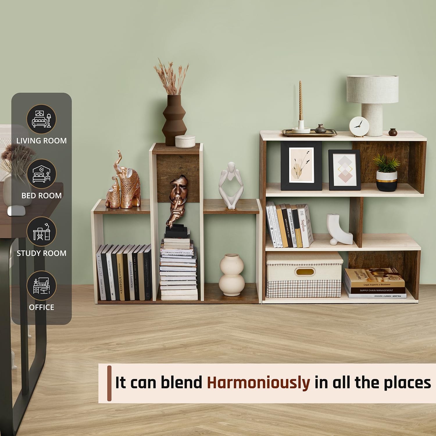 BOOK SHELF FOR HOME:The bookshelf can be used as two separate 3-compartment units and combined as a 6-compartment shelf according to the decoration style of your home. It can be used as a rectangular bookshelf and also as an L-shaped corner bookshelf. Perfect for home library, living room, study room providing flexibility in arranging your books, family photos, decorations, plants and many other items