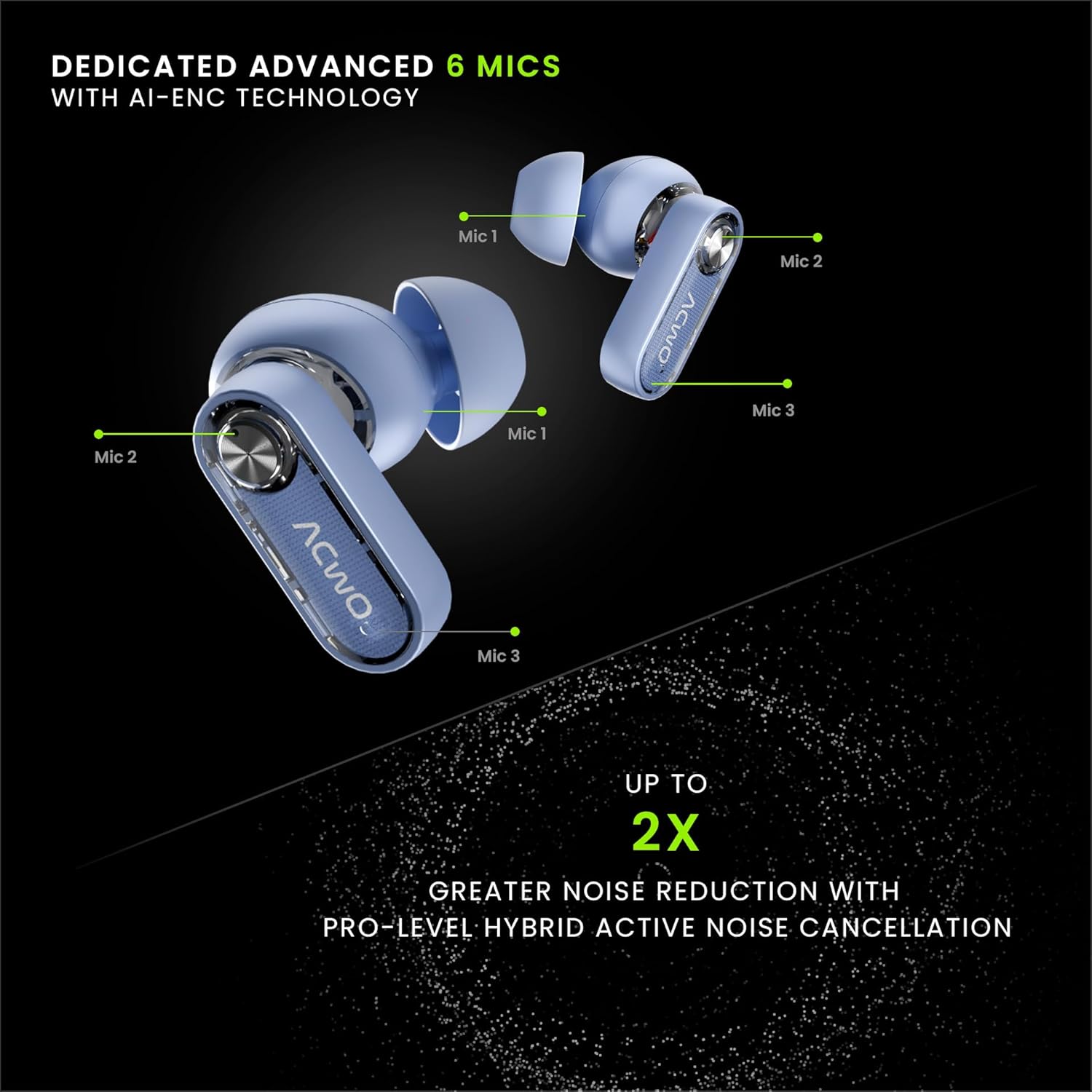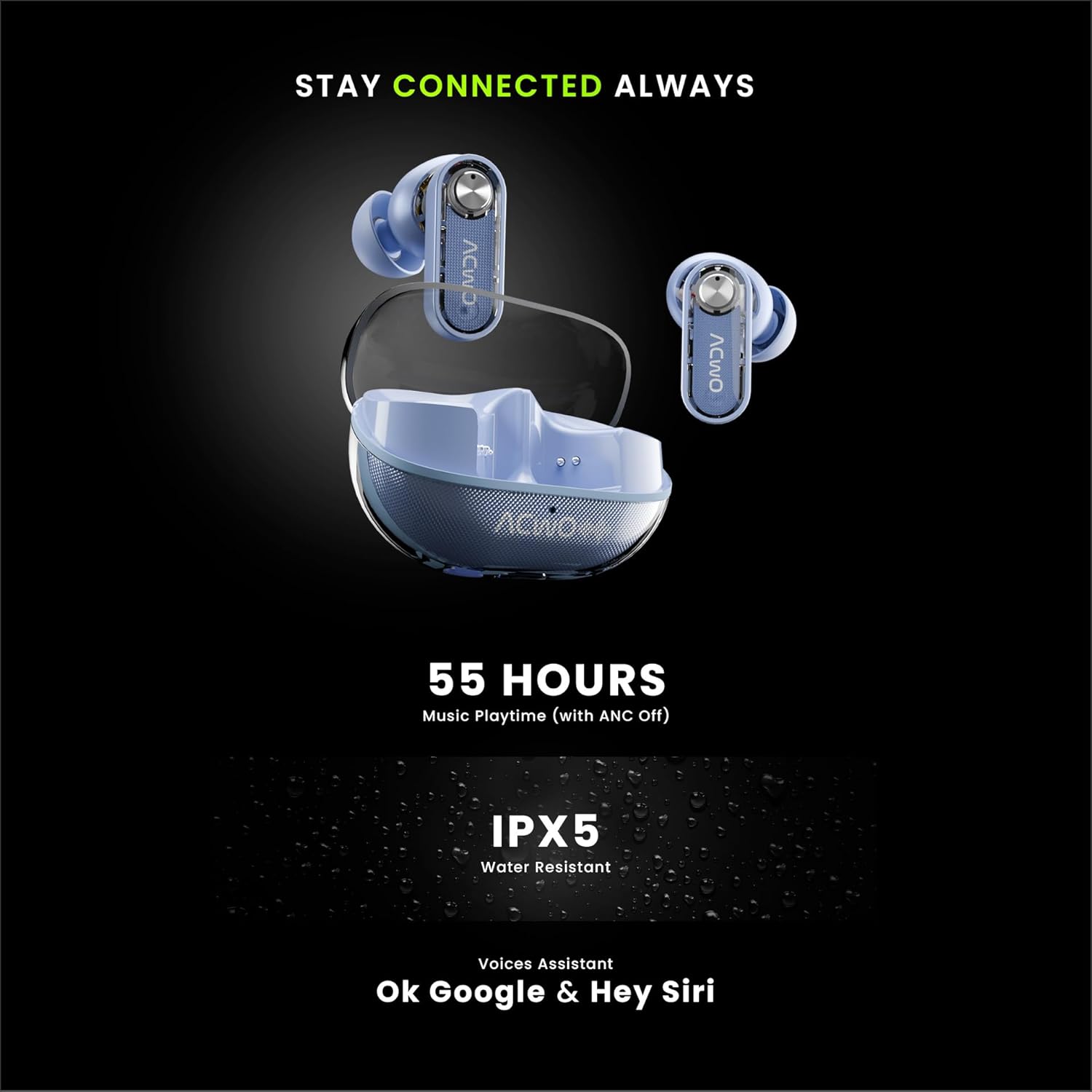 ACwO DwOTS 777 Wireless Earbuds | 50dB Hybrid ANC | Advanced 6 Mics with AI-ENC | Transparency Mode | 3 EQ Modes | Minimal Transparent Design | IPX5 Water & Sweat Resistant (Gen Blue)