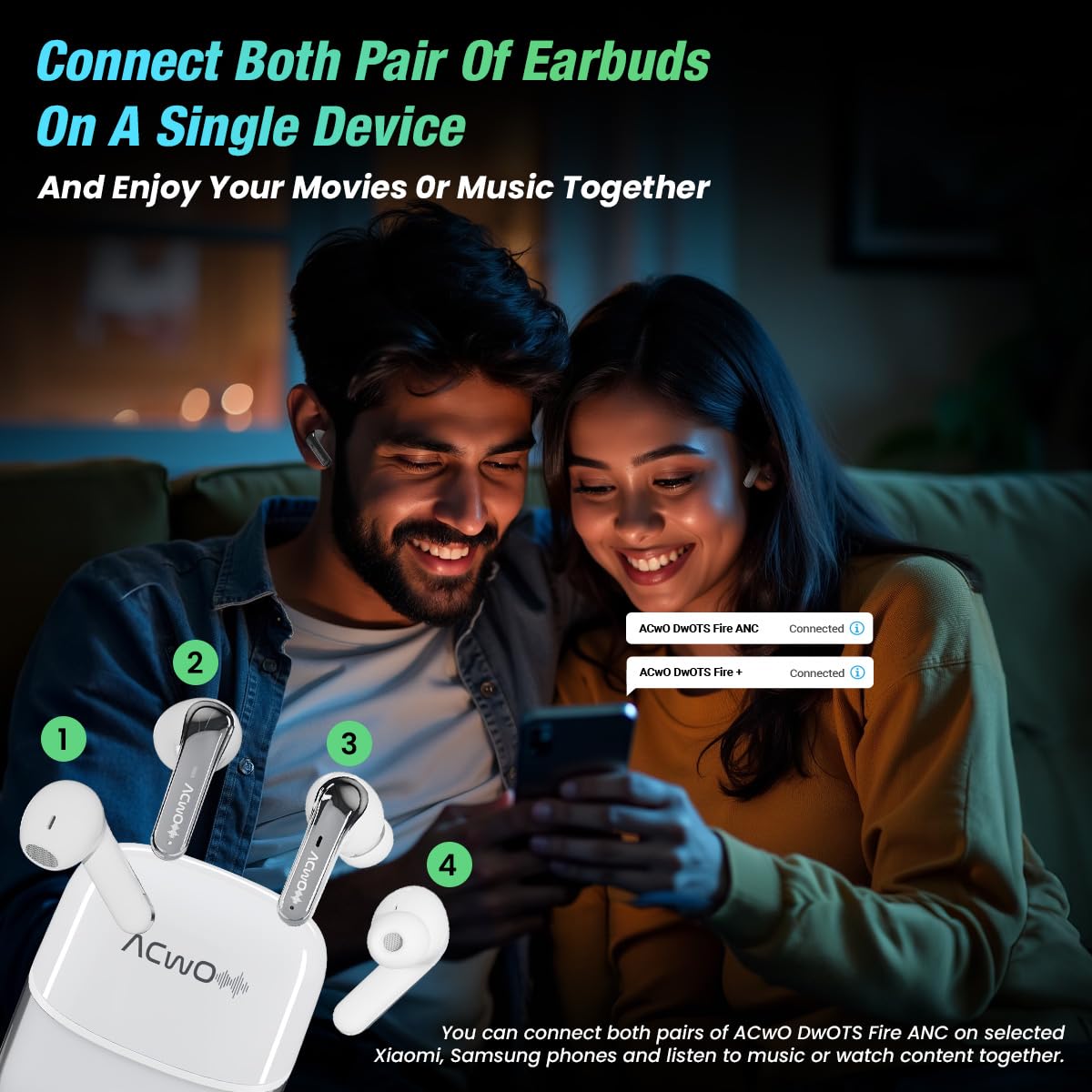 ✅[Two Way To Enjoy Your Fire ANC]: Imagine the flexibility of sharing your favorite sounds in two different ways. With the ACwO DwOT Fire ANC, you can connect each pair of earbuds to separate devices – perfect for when you and a friend want to enjoy different content without compromise. Alternatively, you can connect both pairs to a single device, making it ideal for those cozy movie nights or binge-watching sessions with someone special, ensuring every scene is enjoyed together.