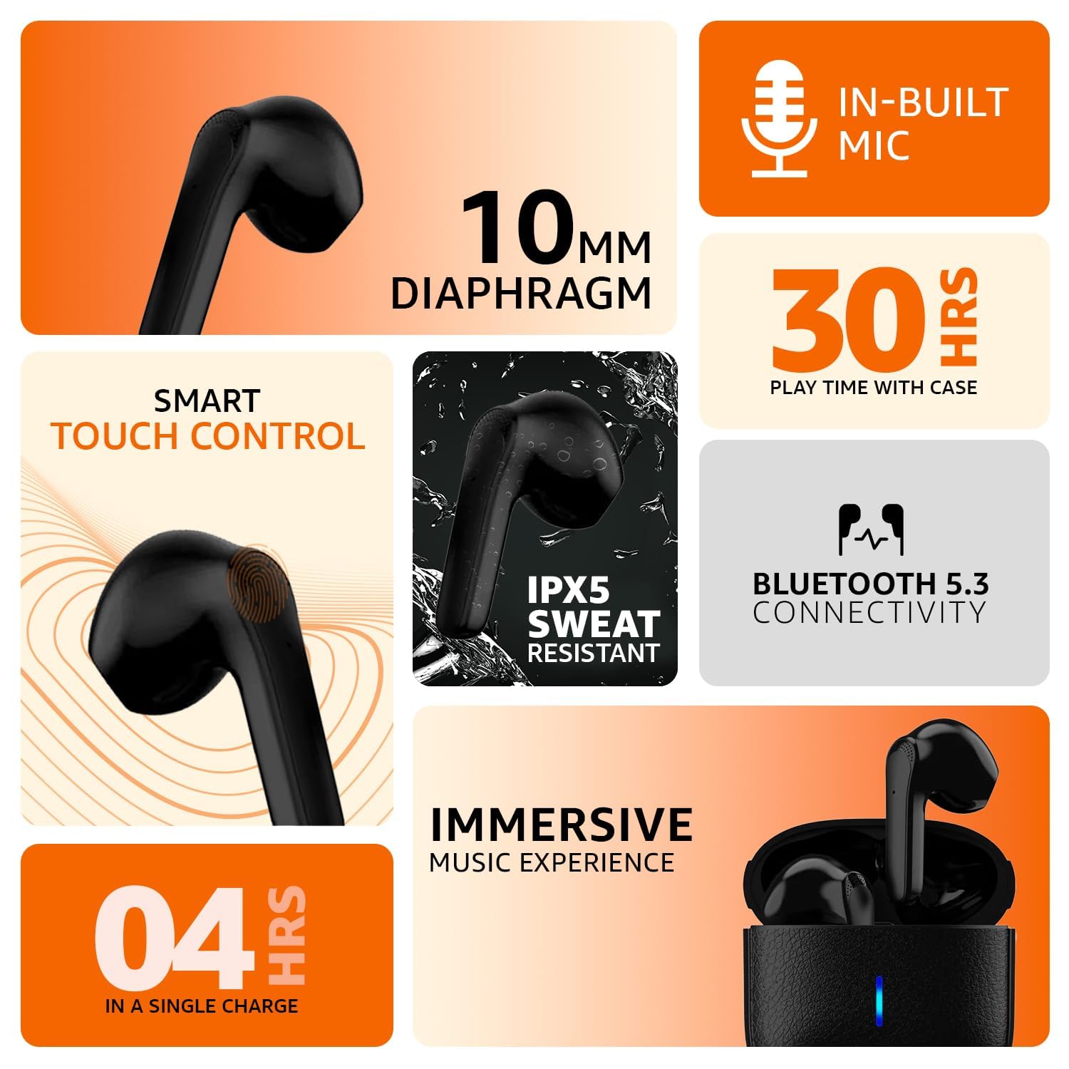 Amazon Basics True Wireless in-Ear Earbuds with Mic, 10MM Dual Drivers, Up to 56ms Low Latency, IPX5 Sweat & Water Resistant, Bluetooth 5.3, Up to 30 Hours Play Time, Fast Charging (Black)