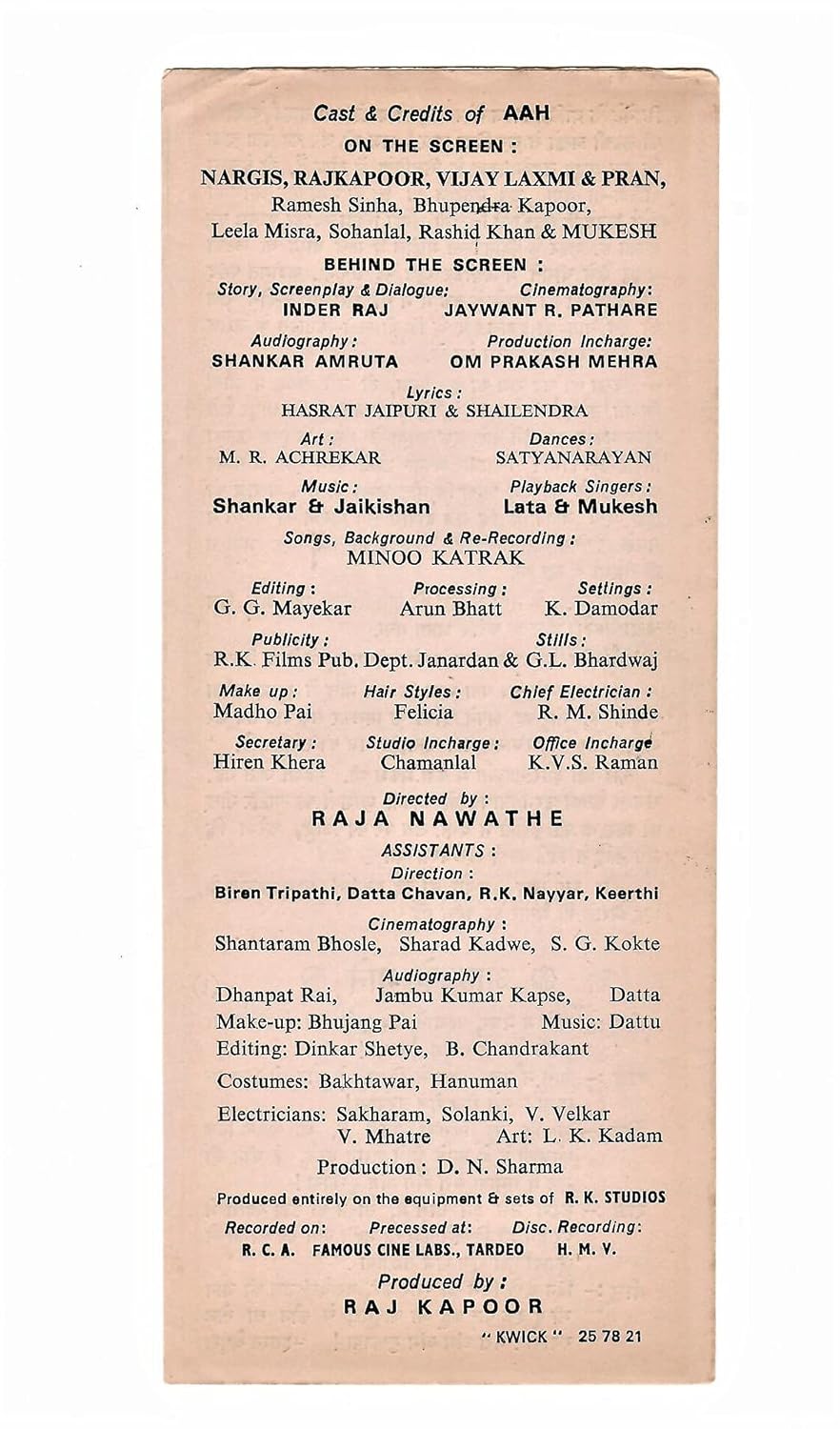 Main Cast – Raj Kapoor, Nargis, Vijay Laxmi, Pran