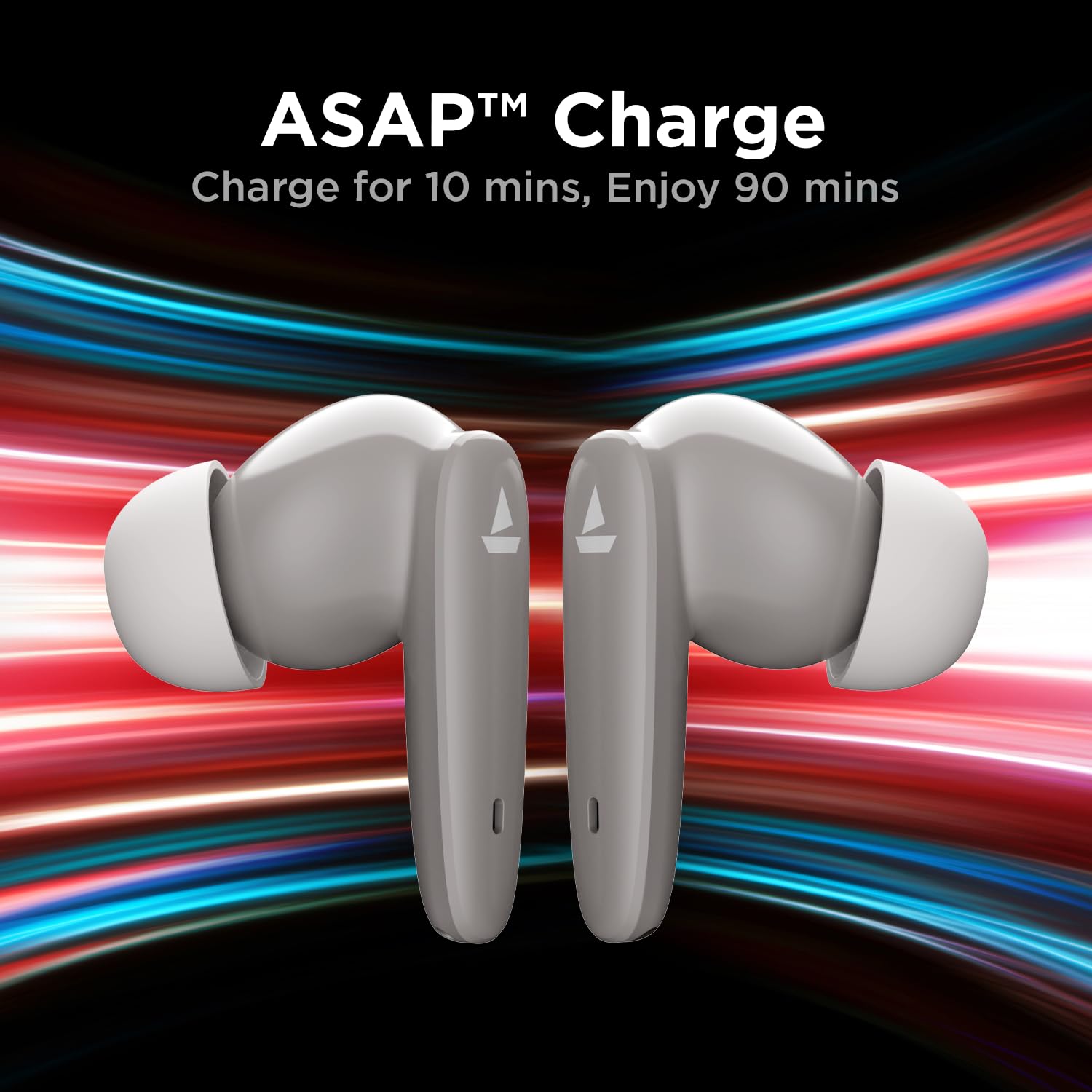 ASAP Charge- Courtesy our ASAP Charge tech, these true wireless earbuds can garner up to 90Min of playtime in just 10Min of charging. Wireless range: 10 m