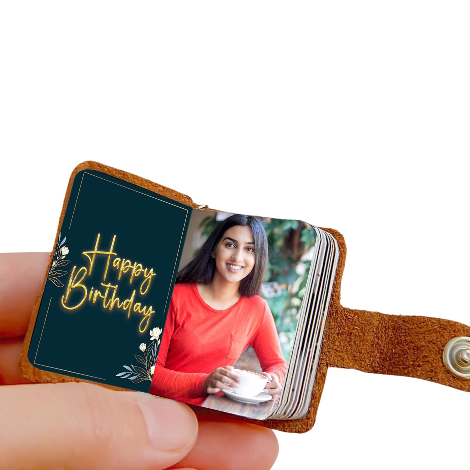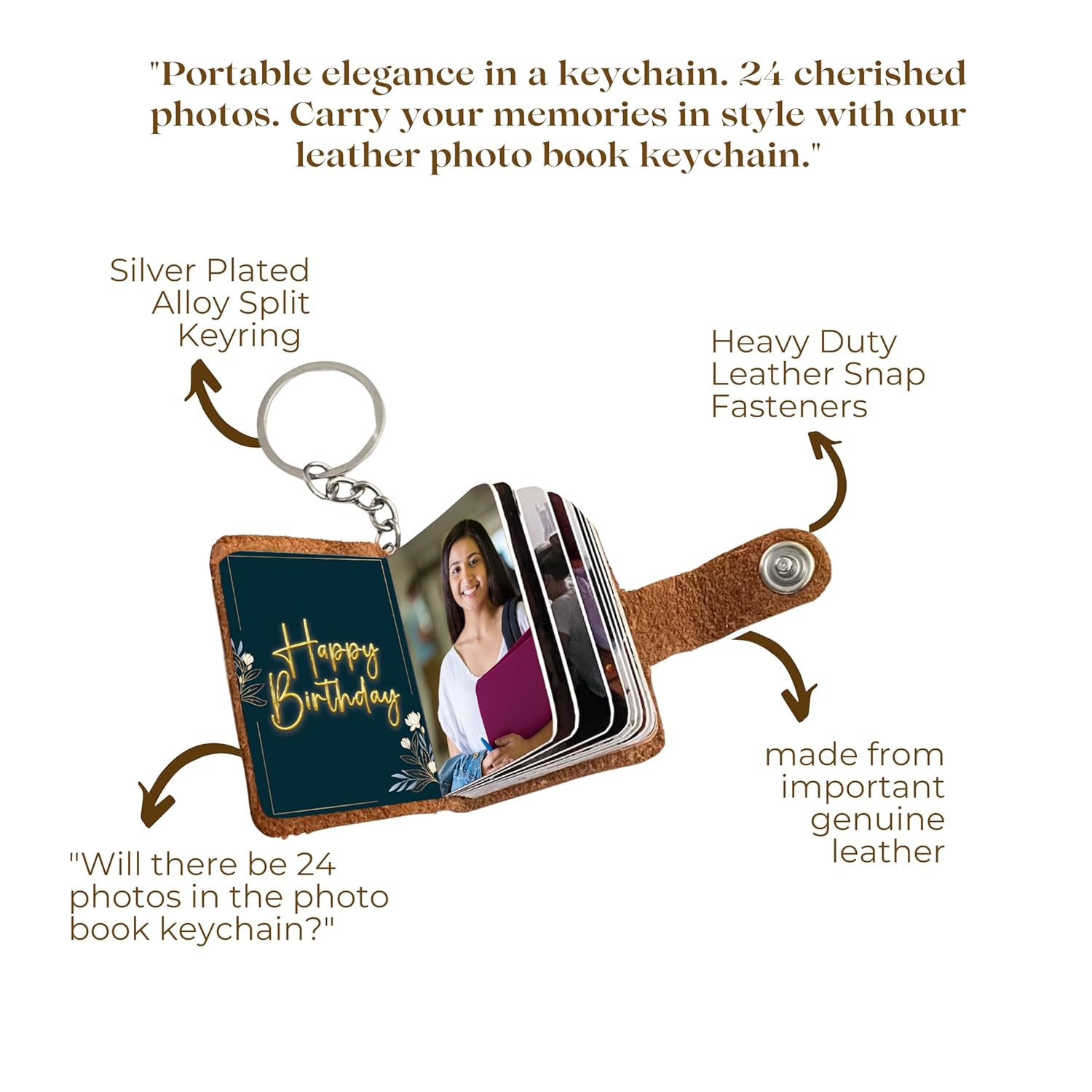 Flashing Click “Discover the charm of bespoke elegance with our Personalized Leather Keyring Photo Album. Crafted from premium natural leather and paired with high-quality matte photo paper, this exquisite keychain is a treasure trove for your memories. Measuring a compact 4 x 5.5 x 1.2 cm, it’s the perfect canvas to showcase 12 to 24 of your favorite photos. An ideal gift for birthdays, anniversaries, weddings, and more, it’s a heartfelt keepsake for couples, families, and loved ones on any special occasion – from Mother’s Day to Valentine’s Day. Celebrate life’s milestones and everyday joys with this timeless memento.”