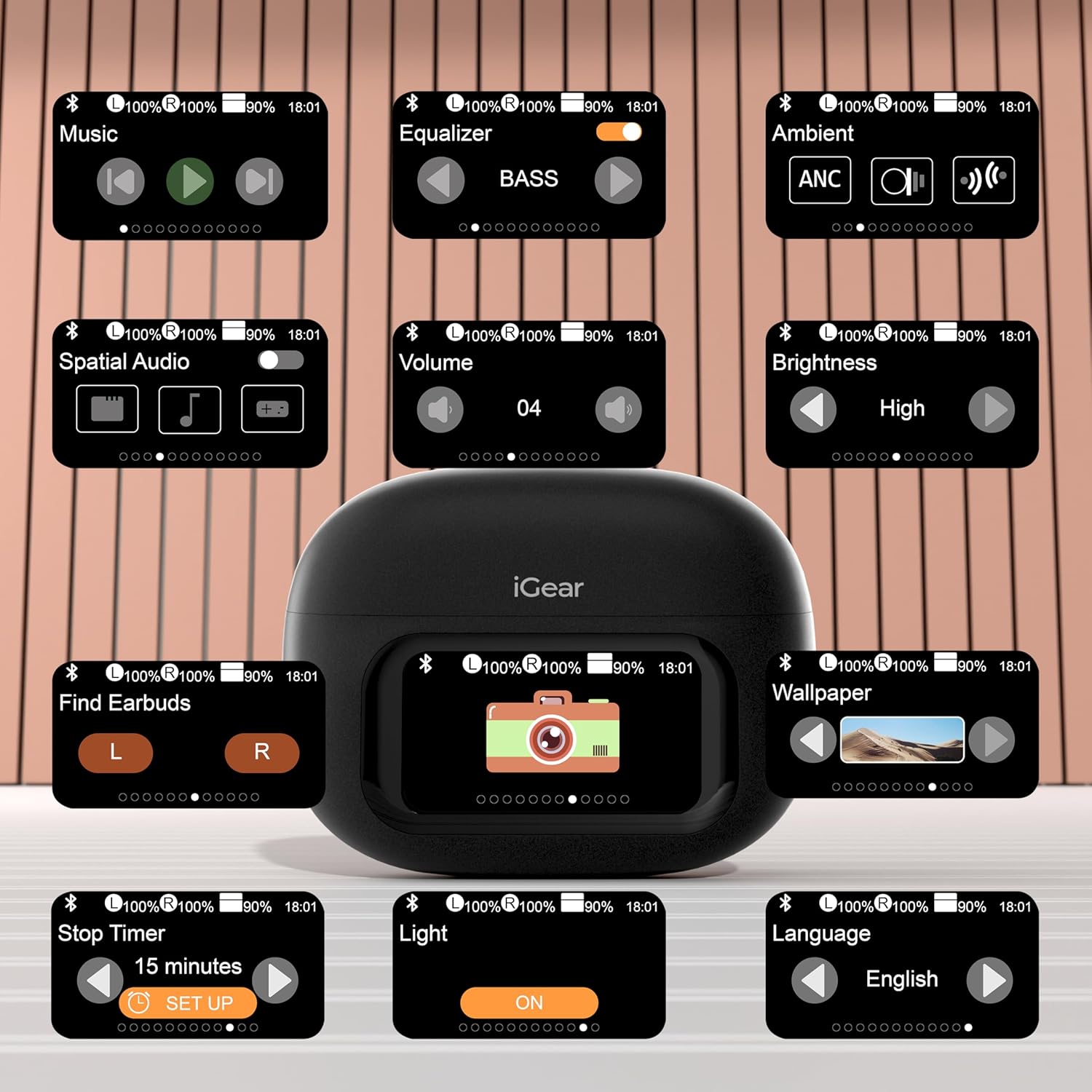 Full-Touch LCD Case: No more fumbling with buttons – PixelPod’s intelligent case gives you access to music control, voice assistants, language change (21 options), camera, timers, brightness, and even spatial audio settings.