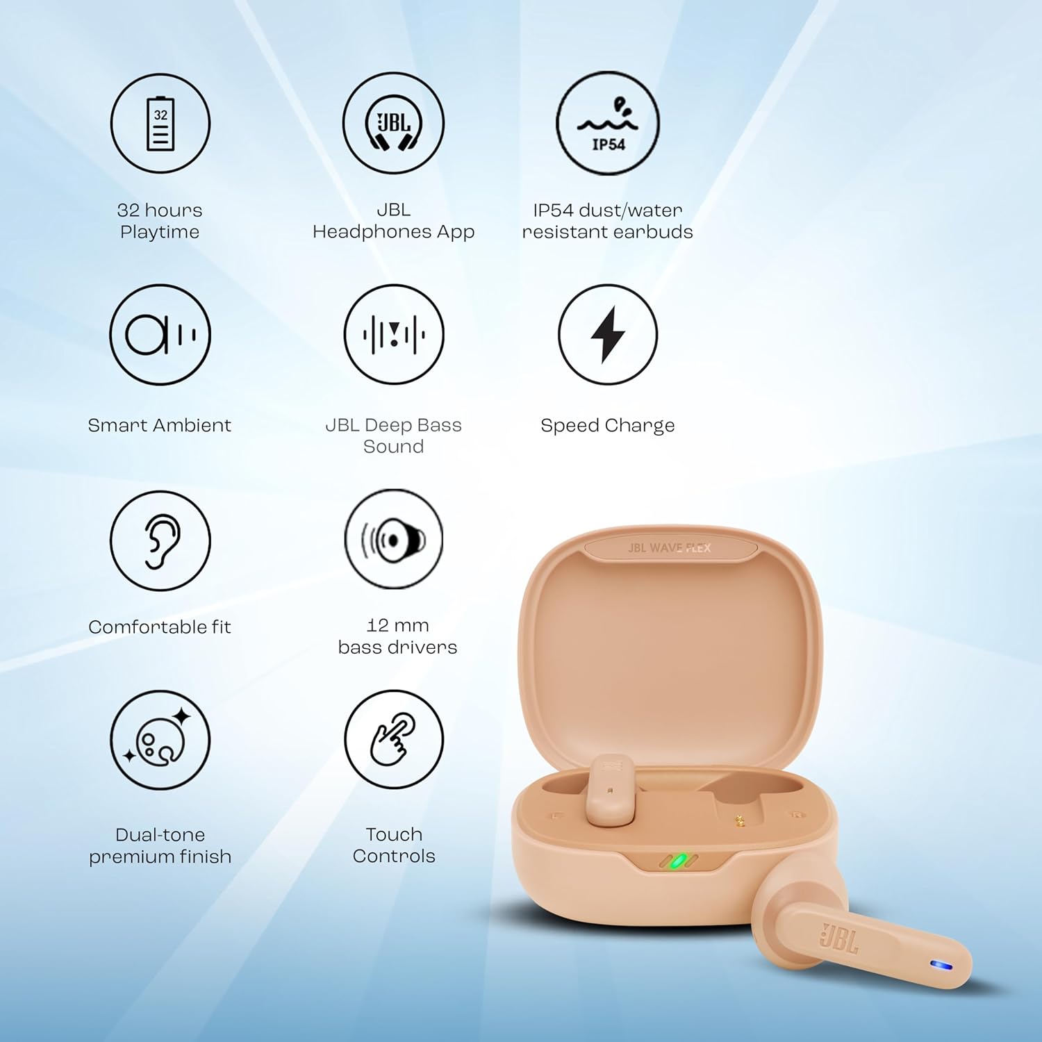 ✅ Playtime : Get 32 hours of playtime (8 hours in the earbuds and 24 in the case) with the JBL Wave Flex. If you run out of battery, a 10 minute charge will give you 2 extra hours