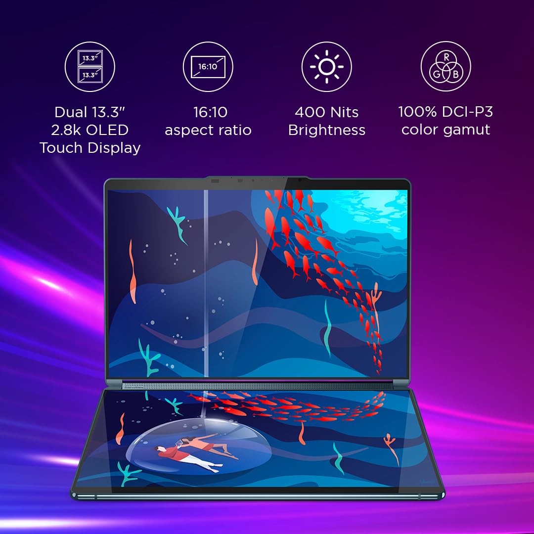 Display: Dual screen 2×13.3″ 2.8K (2880×1800) OLED Brightness: 400 nits | Glossy | 100pct. DCI-P3 | DisplayHDR HDR 500 | Dolby Vision