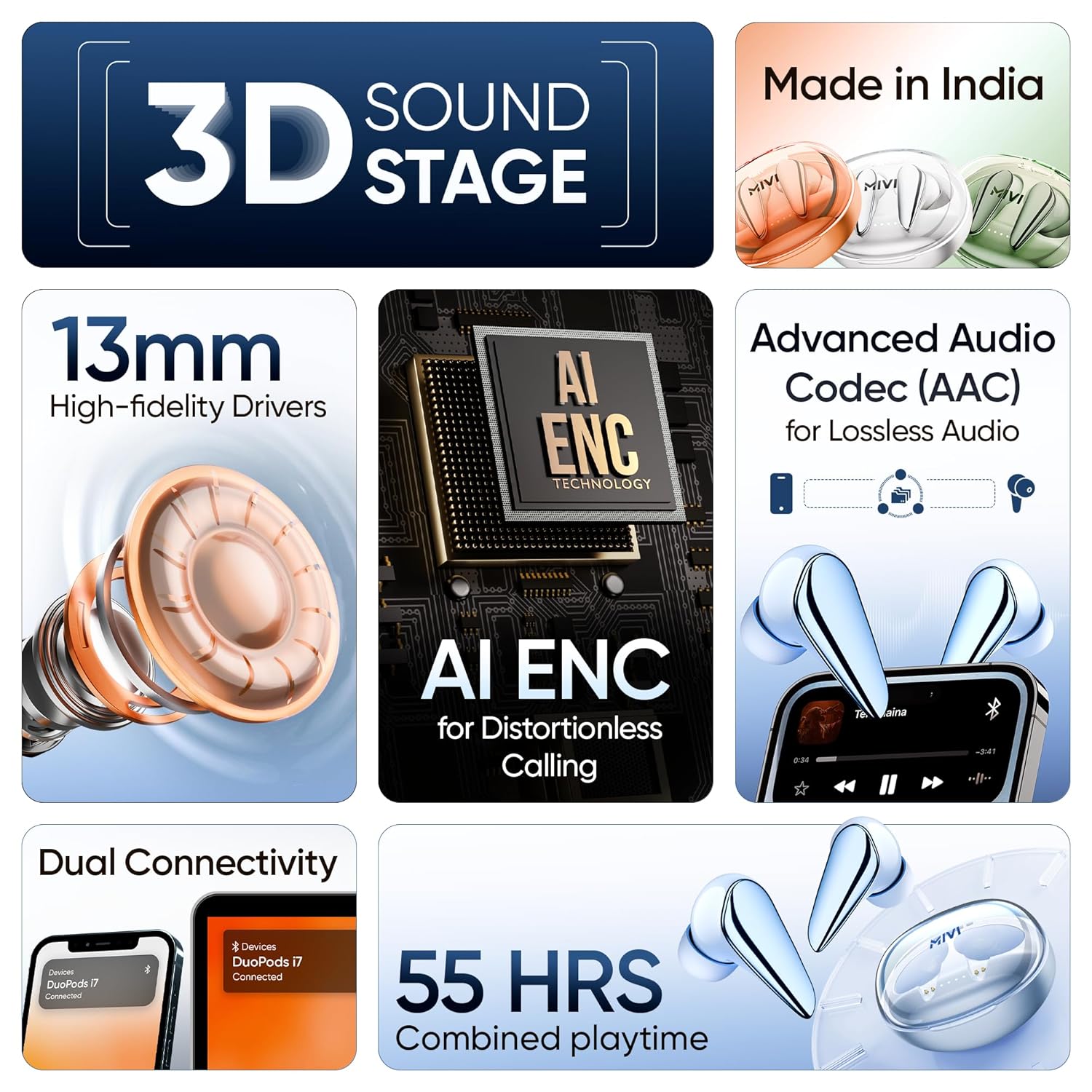 Advance to the next level of revolutionary tech in audio with Mivi DuoPods i7. These DuoPods come with 3D Soundstage, a next-level immersive technology offering instrument separation. Enter a new dimension of sound with every instrument resonating clearly and distinctly all around you with crystal clarity. The 13mm Electroplated high-fidelity bass drivers have been re-engineered to offer unparalleled bass clarity. Instead of a deep, booming bass that often overpowers the vocals, the team at Mivi Design Studio has amplified the bass to offer clear amplification of processed sound. Experience a wide frequency range, low noise, and super low distortion with clean highs, great mid and crisp lows. This is what makes DuoPods i7 the best earbuds to go for. The Advanced Audio Codec (AAC) offers a lossless audio experience. With AAC, hear every live performance with absolute precision. Every instrument, voice and subtle inflexion is captured with incredible fidelity. The TWS offers crystal clear calling as real as in-person. Thanks to the Artificially enabled ENC which cuts off all the excess environmental noise for a distortionless calling experience. Whether you’re in a noisy coffee shop or a busy office, the Artificial Intelligence in the HDCall technology filters out background noise, enhances voices, and ensures that every syllable is heard loud and clear. These DuoPods come with the latest Bluetooth v5.3 for seamless wireless connectivity up to 10 metres. The playtime on this TWS is massive. The DuoPods i7 offers a massive 55+ Hrs combined playtime on a single charge and 8.5 hours of buds playtime. It comes with swift charge technology with Type C charging that offers 500 minutes of playtime on a 10-minute charge. It also comes with a 50ms low latency gaming mode and IPX 4.0 water and sweat resistance. This TWS comes in a sleek casing crafted with high quality transparent acrylic lid blending seamlessly with the high-end smooth Matt base. The cavity houses a sleek pair of dual-tone buds with a glossy icicle-shaped stem for added comfort. The acrylic lid is tinted in a similar shade to the base for a rich gemstone appeal. The DuoPods i7 earbuds are designed, engineered, and crafted in India by us with love for you.