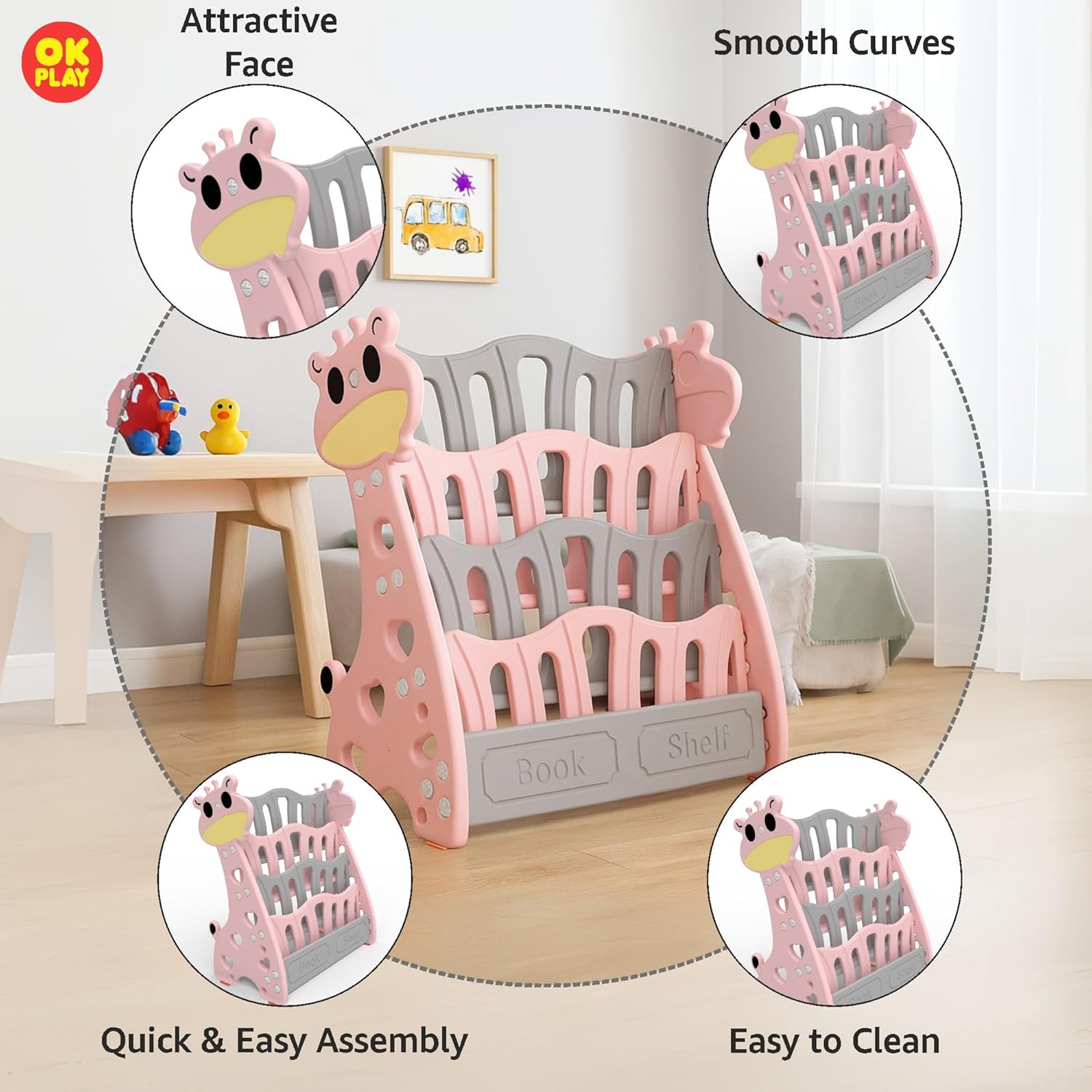 🛡️ Kid-Friendly Design – Crafted from high-quality, non-toxic plastic, this bookshelf features smooth edges, a stable base, and cute giraffe-shaped side panels to ensure both safety and aesthetic appeal in any playroom or nursery.