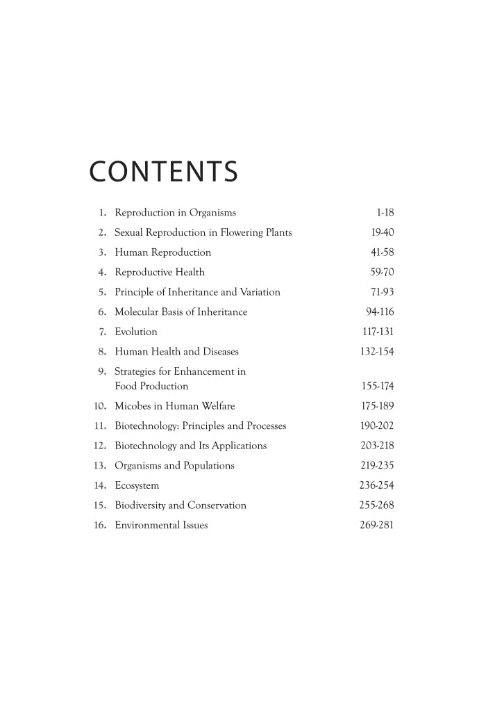 Reproduction in Organisms, Sexual Reproduction in Flowering Plants, Human Reproduction, Reproductive Health, Principle of Inheritance and Variation, Molecular Basis of Inheritance, Evolution, Human Health and Diseases, Strategies for Enhancement in Food Production, Microbes in Human Welfare, Biotechnology: Principles and Processes, Biotechnology and Its Applications, Organisms and Populations, Ecosystem, Biodiversity and Conservation, Environmental Issues