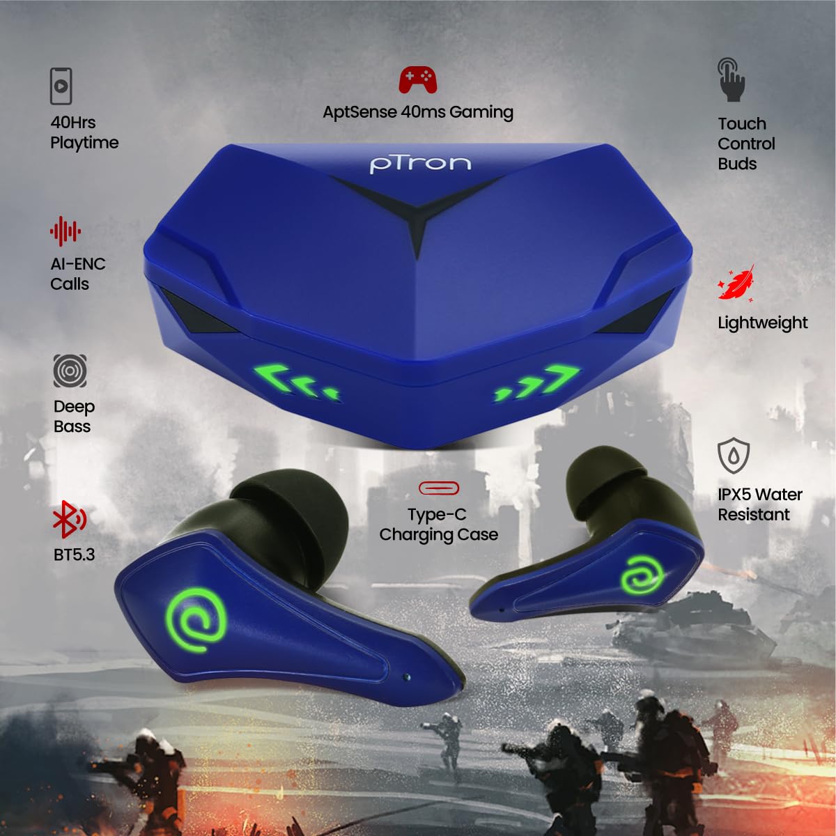 40ms Low-Latency Gaming TWS: Basspods Torq gaming earbuds support 40milliseconds of low latency to ensure reliable transmission near-zero latency. This allows you to transmit the sound from the game to your ears in real time. There is no delay in the game, helping you to kill your opponents in the game and win faster. TruTalk AI-ENC Calls: The built-ENC microphone filters ambient noise and captures pure human voice so that your voice is heard loud & clear by the call recipient. Incredible Sound Powered: This wireless earbuds can deliver music under music mode with a wider soundstage and exceptional accuracy and clarity. 13mm dynamic drivers & bass-up technology enhances bass and offers lossless transmission between your device and the wireless earbuds. Long Battery Life: pTron Basspods Torq Bluetooth headphones have a long battery life of up to 45 hours, and they come with a high-quality charging case, which can charge both earbuds up to 2.5 to 3 times. Charging 1 hour one time, the gaming earbuds can last 10-12 hours of playtime at a medium volume level. Ergonomic Design: The truly wireless earbuds with soft earplugs are specially designed, which can perfectly fit your ears without falling out, and offer you a comfortable wearing experience. Seamless Wireless Experience: Using advanced Bluetooth 5.3 chip technology, lightning-fast and ultra-stable connection, providing a seamless, immersive experience within a 10-meter barrier-free range. Responsively Touch Control: Features with touch control sensors, our wireless earbuds can largely minimize the pressure on your ears when you touch the buttons for various functions – calls, music, voice assistant & mode change. Type-C Fast Charging: The 300mAh high-capacity charging case provides extended battery life for the case of the earbuds. USB-C charging method, faster transmission speed, and more convenient user experience. 1-Year Manufacturer warranty from the date of purchase on manufacturing defects only & customer care details 040-67138888/support@ptron.in
