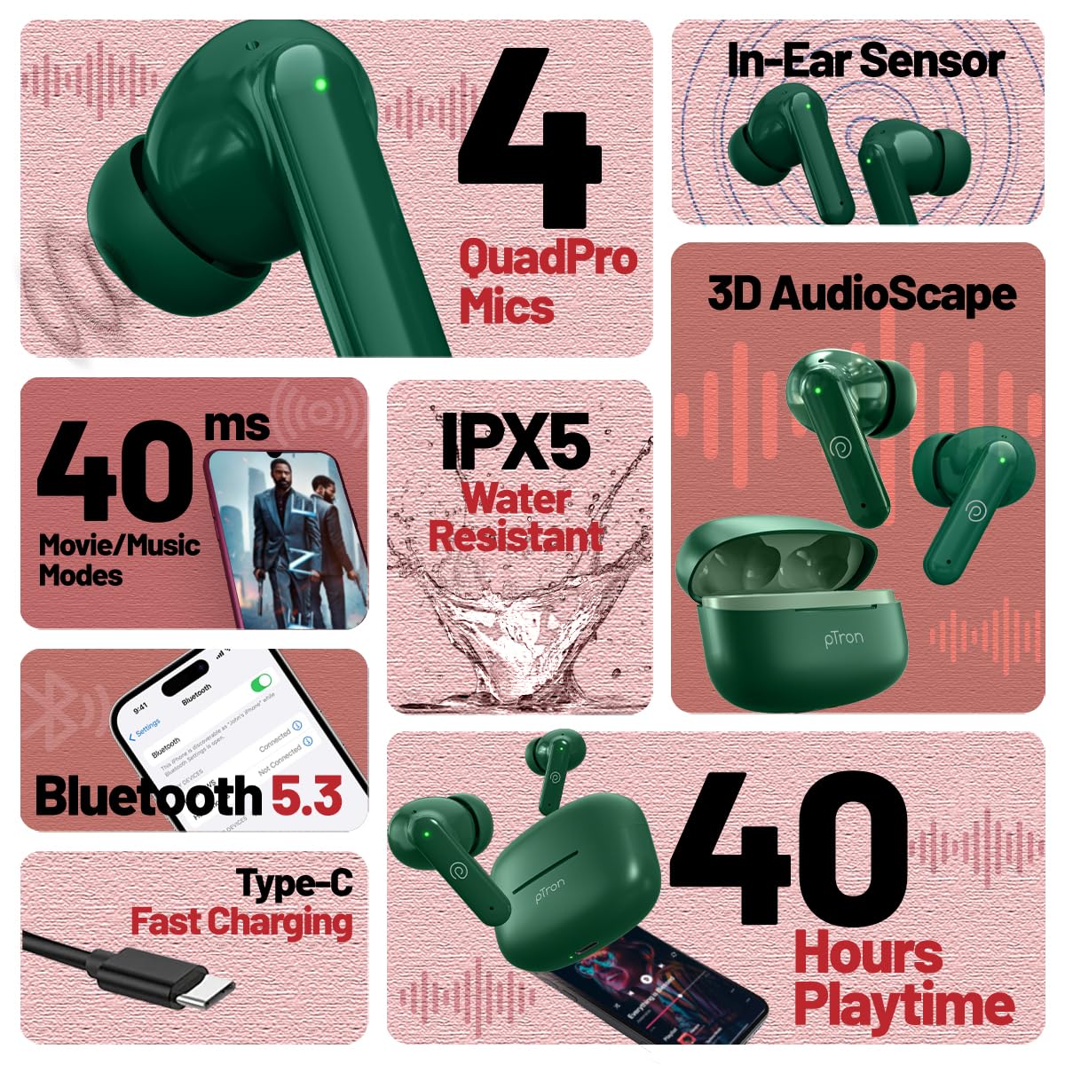 Quad HD Mics & TruTalk ENC tech Filters out Background Noises, Enhancing your Voice Clarity on Calls | 40Hrs Combined Playback Time with Charging Case for Extended Usage.