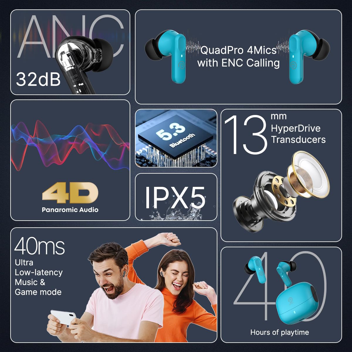 32db ANC & Quad Mic ENC: Zenbuds 1 v2 ANC earbuds cancel background noises up to 32dB for an immersive listening experience. 4 Mic with TruTalk ENC will enhance your voice clarity on calls by 3 times.