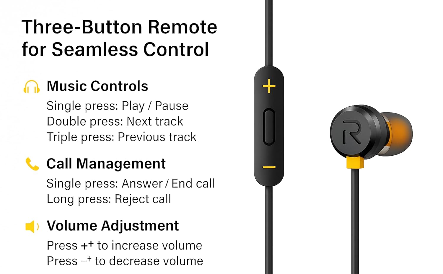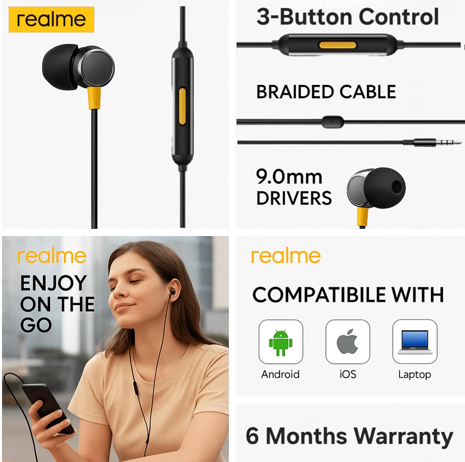 Experience the perfect fusion of fashion and functionality with realme Buds 3. Featuring a sleek half in-ear design, precision-machined ear housings, and a bold color accent, these earphones offer a modern, premium look. The inline controls and tangle-free cable enhance daily usability, while the ergonomic fit ensures lasting comfort. Whether you’re on a call or enjoying music, this is sound you can feel—and style you can flaunt.