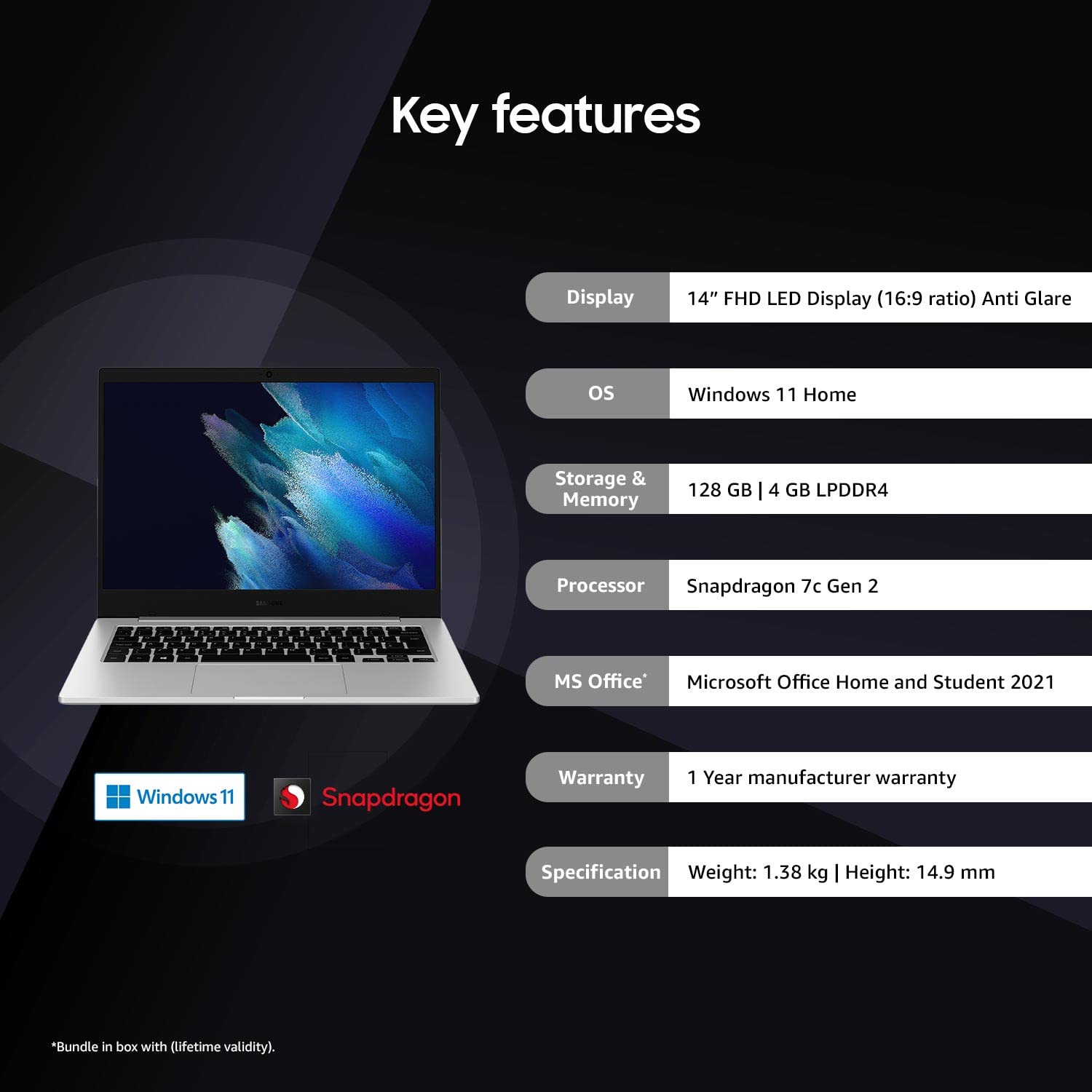 Operating System: Windows 11 Home | Preinstalled Software: MS Office Home & Student 2021, Live Message, Live Wallpaper, McAfee Live Safe (Trial), Screen Recorder, Samsung Gallery, Samsung Flow, Samsung Notes, Samsung Recovery, Samsung Settings, Studio Plus, Samsung Update, Samsung Security, Quick Share, Galaxy Book Smart Switch