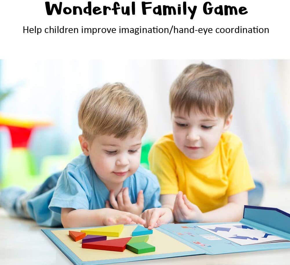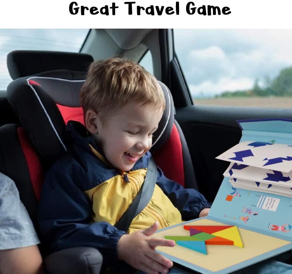 Entertaining & Educational Travel Games for Kids: Entertaining wooden puzzles Endless puzzle fun, many different shapes for kids to challenge! Kids will feel proud when he/she make out the shapes. Educational brain teaser games 48 different shapes on the key pictures, and have rising difficulty, especially the last 8 shapes, even challenges for adults! Kids need focus and imagination to make out all the shapes, good for brain training and math abilities. Excellent travel games for long rides, planes, or take out for restaurants! Keep kids busy and quiet for hours! They won’t feel boring during the whole trip! Tangram Puzzle Book 2.0 What we have improved: Black & colorful key pictures on both sides, shows clearly how to make each shape. 7 wooden blocks( better than foam or plastic) Bigger key pictures Larger magnetic surface, easy to make up shapes freely. Stronger magnets, won’t fall off easily Multi-shape puzzles Our Magnetic Tangram is based on the education of children’s growth and the psychological law, the combination of education and game will foster children’s practical and brain coordination ability. Educational Toys & Gifts Our travel games for toddlers can enhance kid’s patience, observation, practical ability, suitable for kindergarten educational toys. a fancy learning and teaching game for kids age 3+ Safe & High Quality We have created beautifully designed imagination- and creativity-sparking products. It is made of safe paints material, by 100% wood. It’s safe and easy to take which doesn’t hurt children’s hands. Colorful Magnetic Tangram The tangram contains 7 small colorful simple magnetic plates. Our magnetic shapes activity box features easy-to-grasp magnets that kids can use to create multiple geometric pictures.