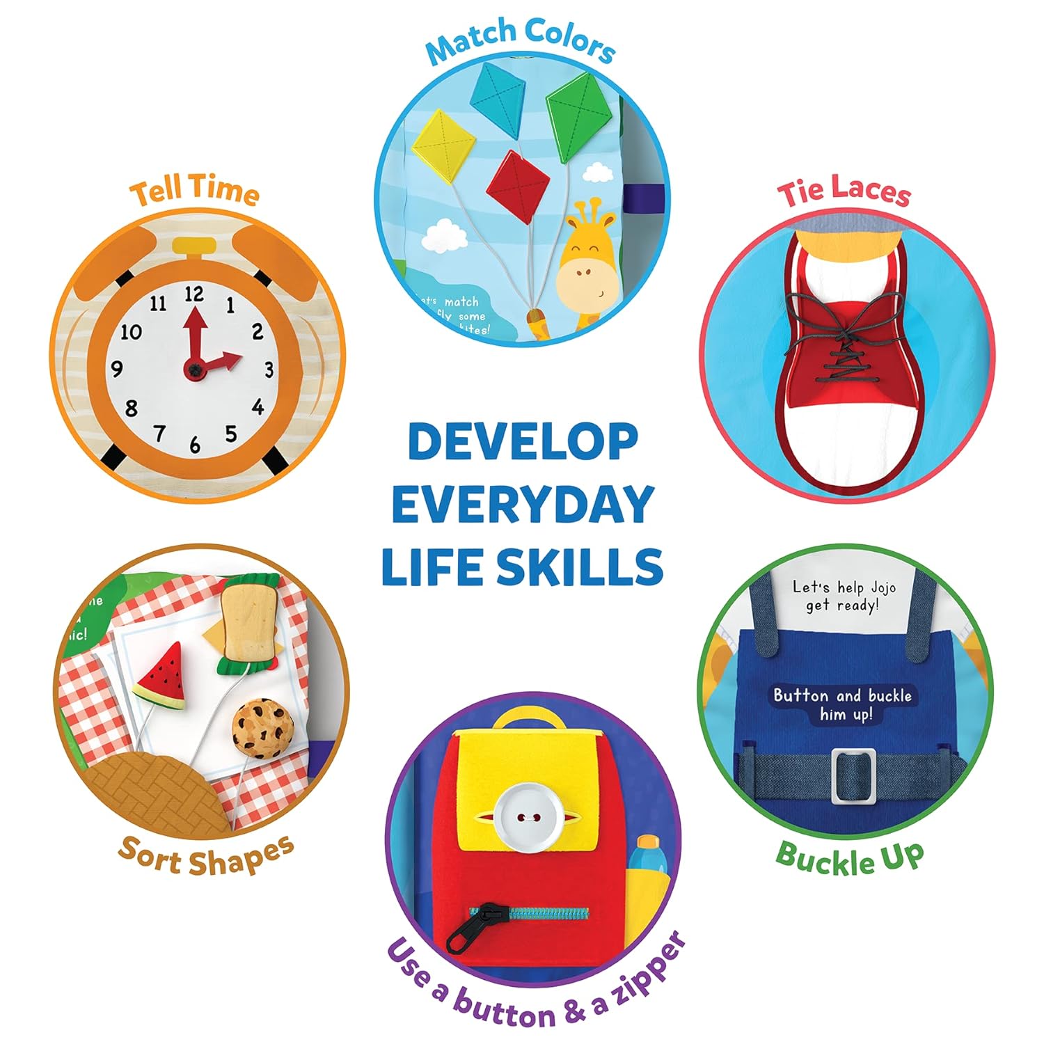 DEVELOP EVERYDAY LIFE SKILLS: The Skillmatics Quiet Book is carefully designed to help young children learn how to tell the time, tie laces, buckle up, use a button and a zipper, and build other key fine motor skills as they get Jojo the giraffe ready for a fun day at the park!