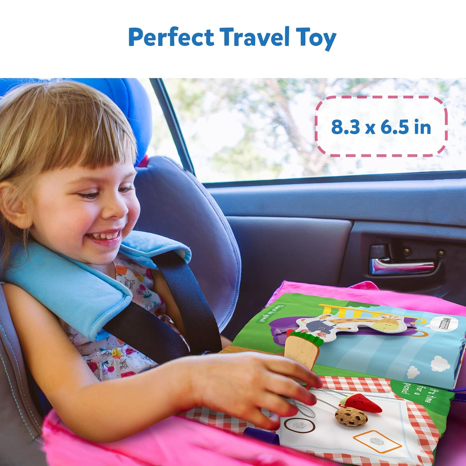 TODDLER TRAVEL TOY: This soft, lightweight activity book is a versatile travel toy for toddlers. It comes with a hanging strap for easy attachment to a car seat or stroller, and has interactive activities for on-the-go entertainment.