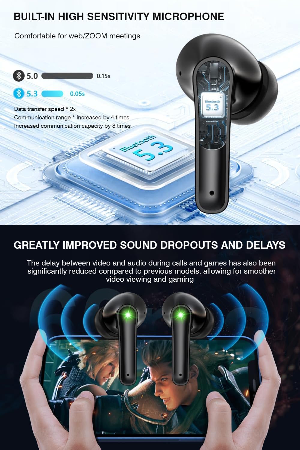 【Up to 48H Playback Time and Bluetooth 5.3】It only takes 1.5 hours to fully charge the case,and providing earbuds with up to 48 hours of looping playback time.And the earbuds provides up to 3-4 hours of single play time after 1H single charge.Use the latest 3rd Bluetooth 5.3 chip to provide faster and more stable signal connection and lossless sound transmission.